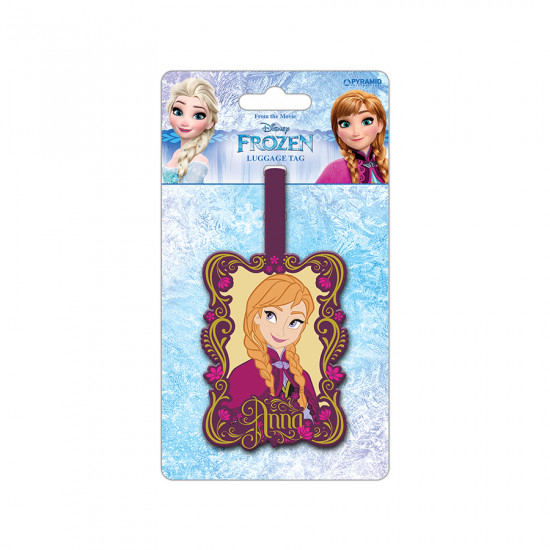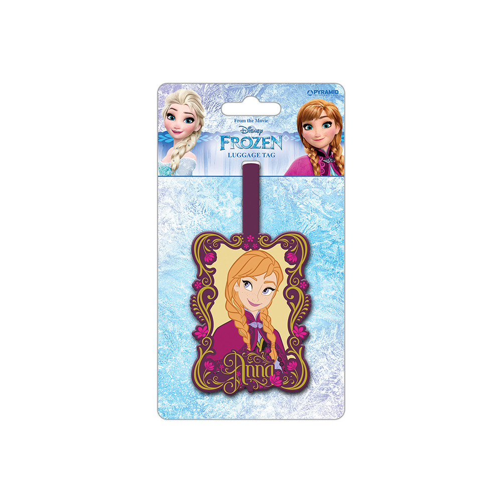 Princezna Anna s úsměvem na tváři je námětem pro visačku, kterou si mohou děti zavěsit na své zavazadlo.