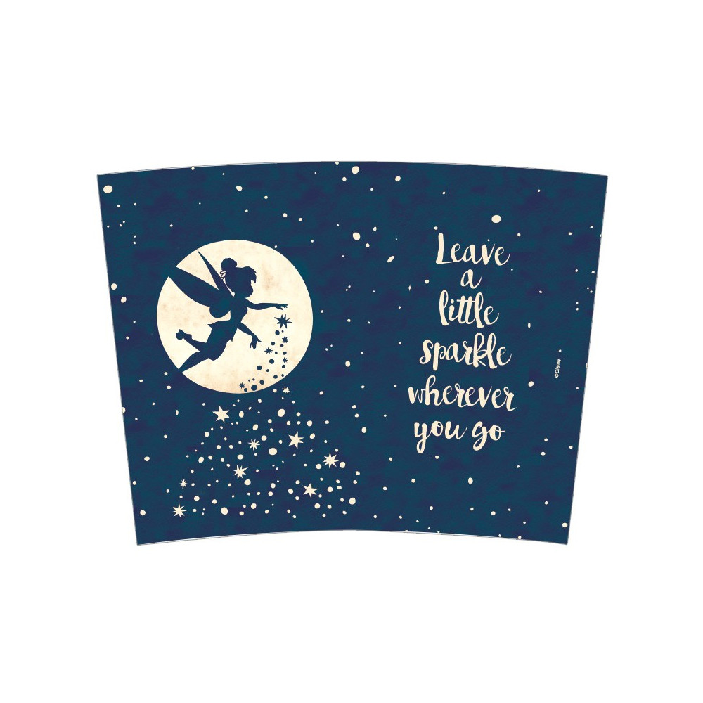 Design inspirovaný pohádkovou atmosférou Disney s Tinkerbell letící před měsíčním kotoučem doplňuje inspirativní citát „Leave a little sparkle wherever you go“.