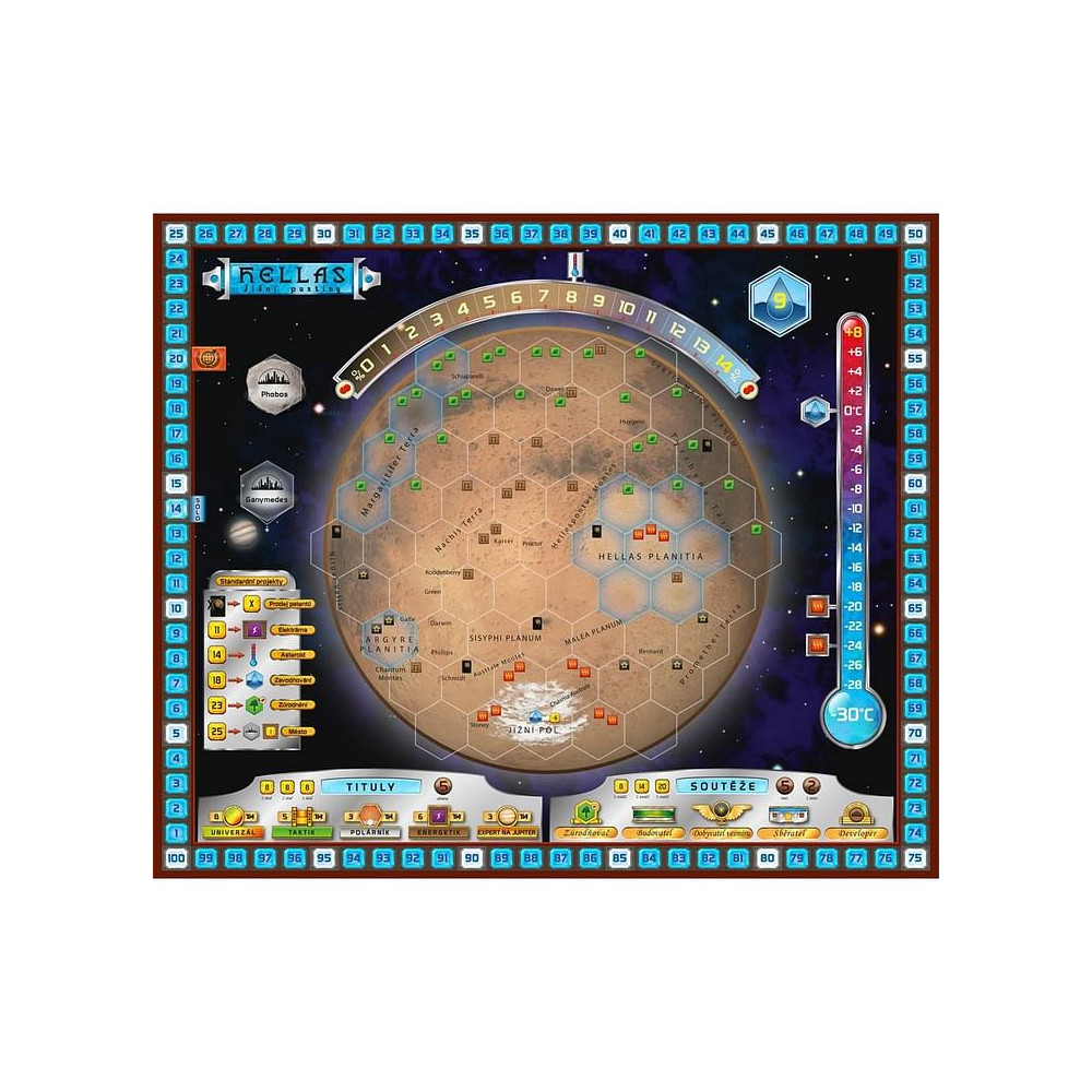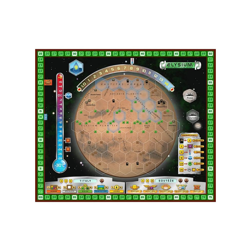 Ve hře Mars: Teraformace objevte nová území a vyzkoušejte nové strategie! Místo původního herního plánu můžete použít některý z obou nových. Znázorňují jiné části Marsu, jsou na nich vyznačeny jiné bonusy za umístění destiček, jiné oblasti pro destičky oceánu a nové čestné tituly a soutěže.