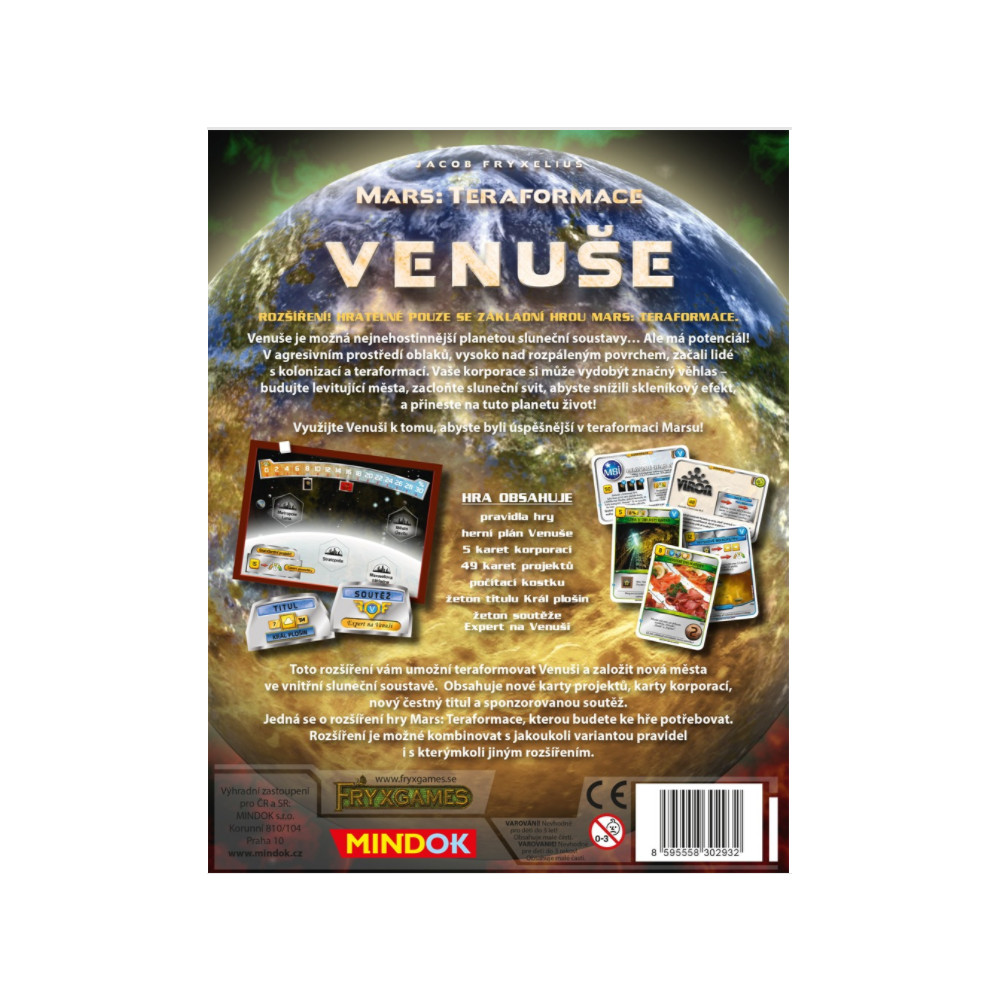Venuše je možná nejnehostinnější planetou sluneční soustavy… Ale má potenciál! V agresivním prostředí oblaků, vysoko nad rozpáleným povrchem, začali lidé s kolonizací a teraformací. Vaše korporace si může vydobýt značný věhlas – budujte levitující města, zacloňte sluneční svit, abyste snížili skleníkový efekt, a přineste na tuto planetu život! Využijte Venuši k tomu, abyste byli úspěšnější v teraformaci Marsu!