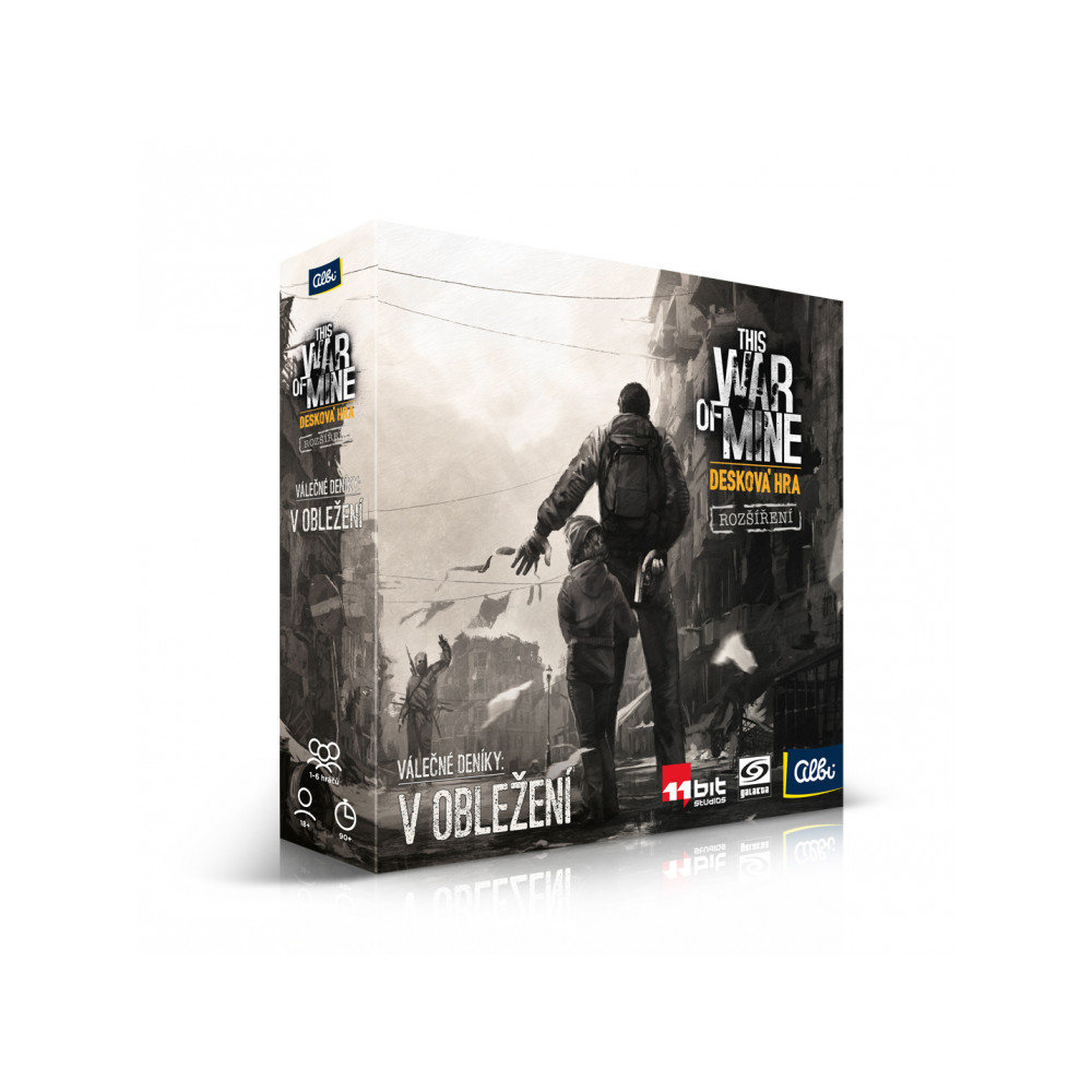 Hra This War of Mine: V obležení obsahuje: válečný deník, sv. II, 5 karet dějství, přehledovou kartu, 100 dalších karet, 57 žetonů, 6 plastových podstavců, 7 figurek, mapu města a pravidla.