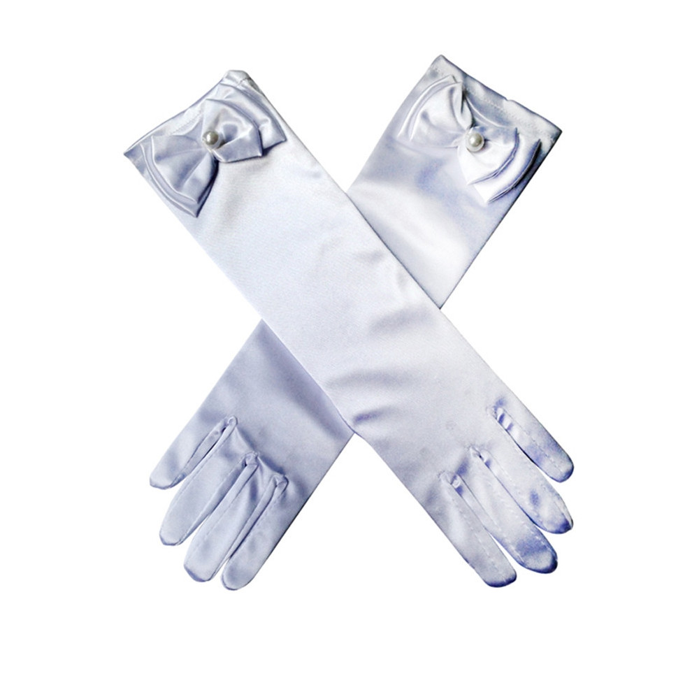 Elegantní dětské rukavice pro princezny ve více barvách. Saténový vzhled s mašlí a perlou – ideální na kostýmy i slavnostní příležitosti.