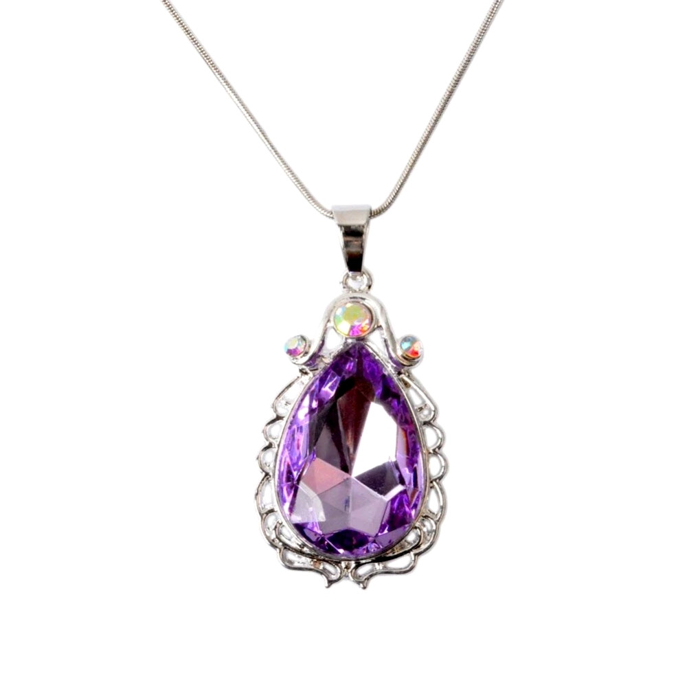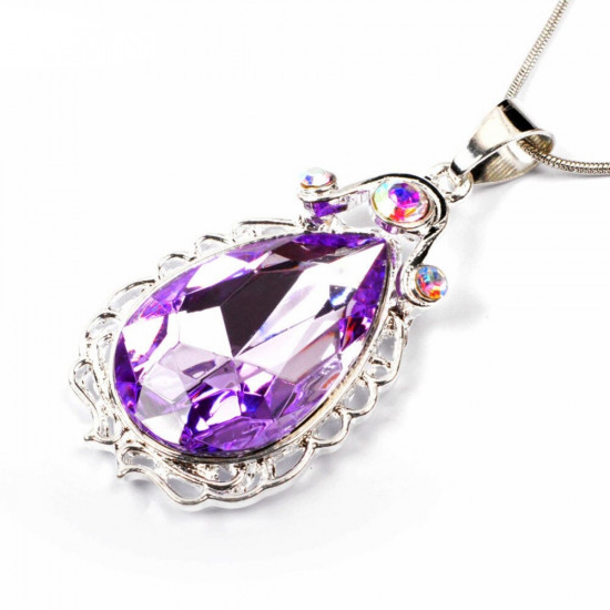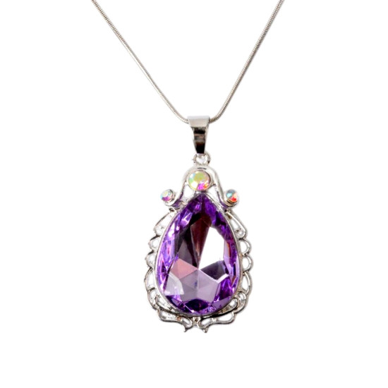 Elegantní fialový amulet ve tvaru kapky je zasazený do jemného stříbrného rámečku zdobeného třpytivými kamínky. Jemný řetízek pohodlně sedí na dětském krku a celý náhrdelník působí pohádkově a ušlechtile – přesně jako šperk skutečné princezny.
