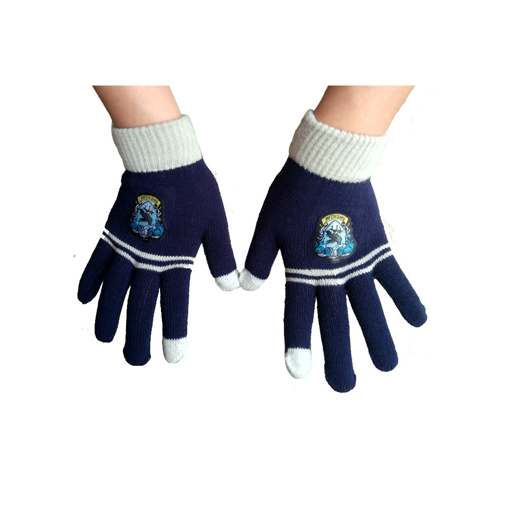 Modré rukavice s šedými detaily a havraspárským znakem jsou vyrobeny z kombinace bavlny a polyesteru. Díky pružnému materiálu se dobře přizpůsobí většině dětských i menších dospělých rukou. Palec a ukazovák mají vodivé zakončení, které umožňuje ovládání dotykových obrazovek i v rukavicích.