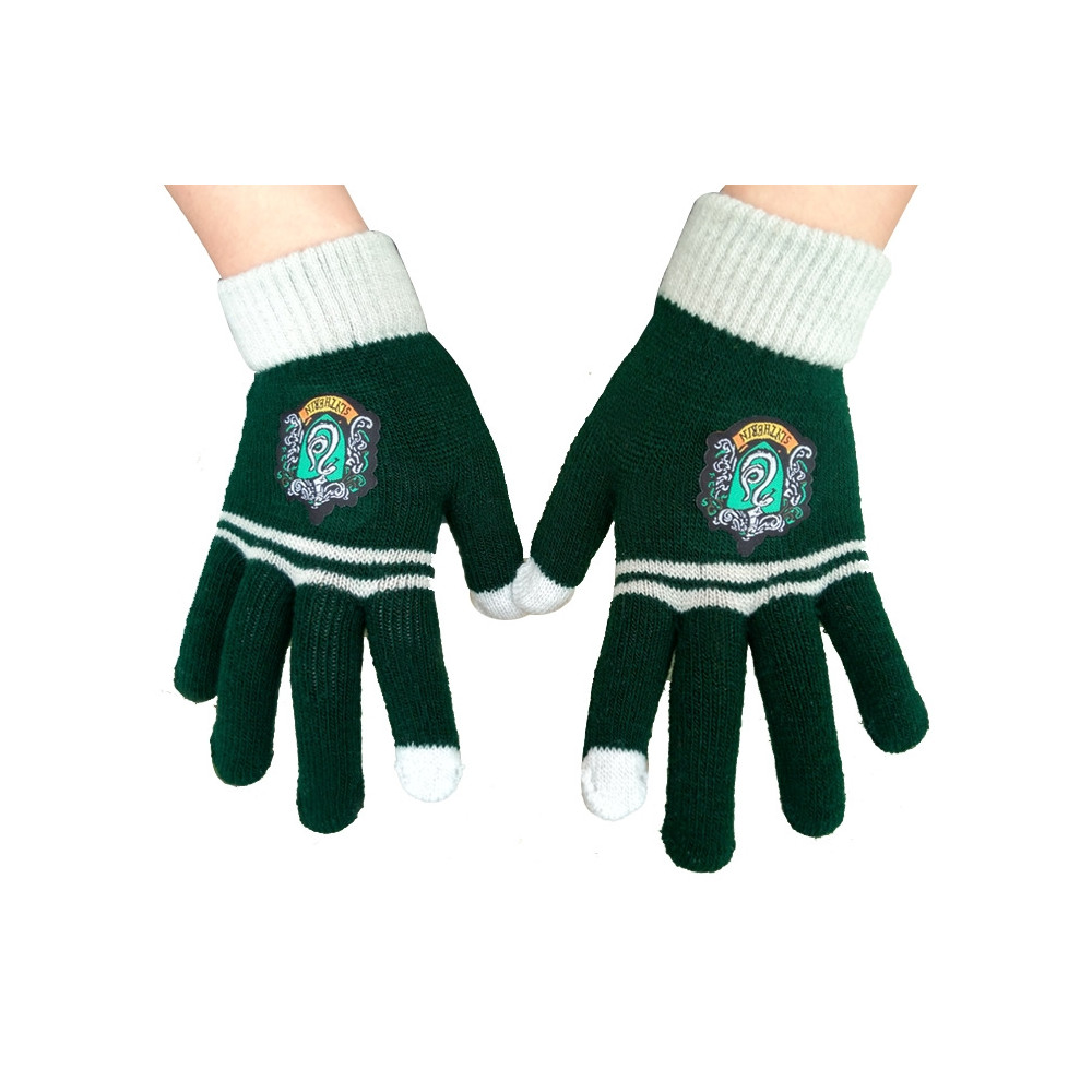 Tmavě zelené rukavice s šedým lemem, stylovými proužky a znakem Zmijozelu na hřbetu ruky jsou vyrobeny z měkké kombinace bavlny a polyesteru. Díky vodivým konečkům na palci a ukazováku můžete snadno ovládat dotykové obrazovky, aniž byste si museli sundávat rukavice.
