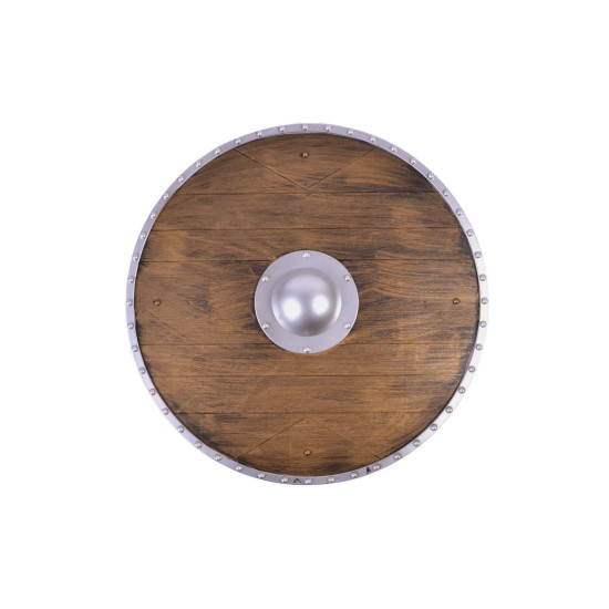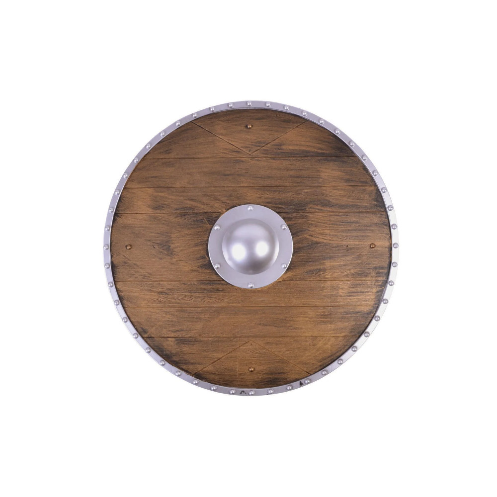 Kulatý štít v designu dřeva s kovovým středem působí realisticky a robustně. Detailní zpracování s imitací kovového okraje a výrazným středovým puklem připomíná výzbroj skutečných vikingských bojovníků i středověkých rytířů.