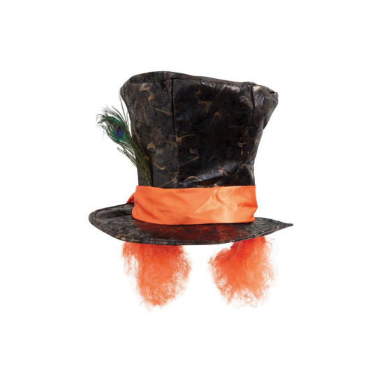 Vysoký černý klobouk s jemným vzorem doplňuje výrazná oranžová stuha, ozdobné pírko a nápadné oranžové vlasy po stranách. Díky tomu vytvoříte kompletní a výrazný vzhled bez nutnosti dalších doplňků. Ideální volba pro karnevaly, tematické večírky, cosplay i divadelní vystoupení.