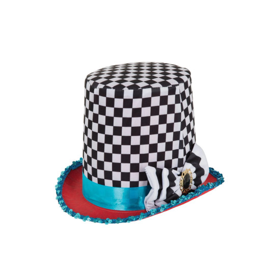 Výrazný černo-bílý kostkovaný vzor doplňuje tyrkysová stuha, zdobená mašle s ozdobnou sponou a kontrastní lem s flitry. Tento klobouk okamžitě upoutá pozornost a perfektně doplní kostým Šíleného kloboučníka. Ideální volba pro karnevaly, tematické večírky, cosplay i divadelní vystoupení.