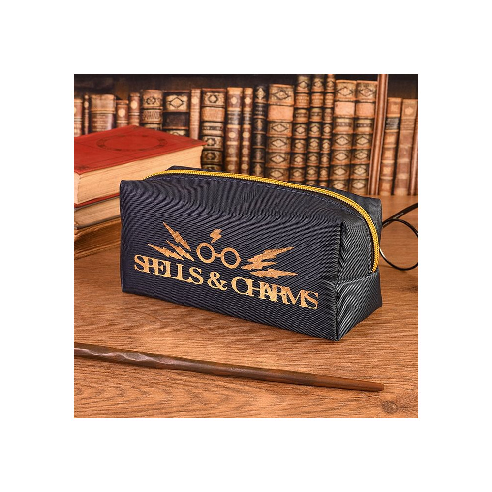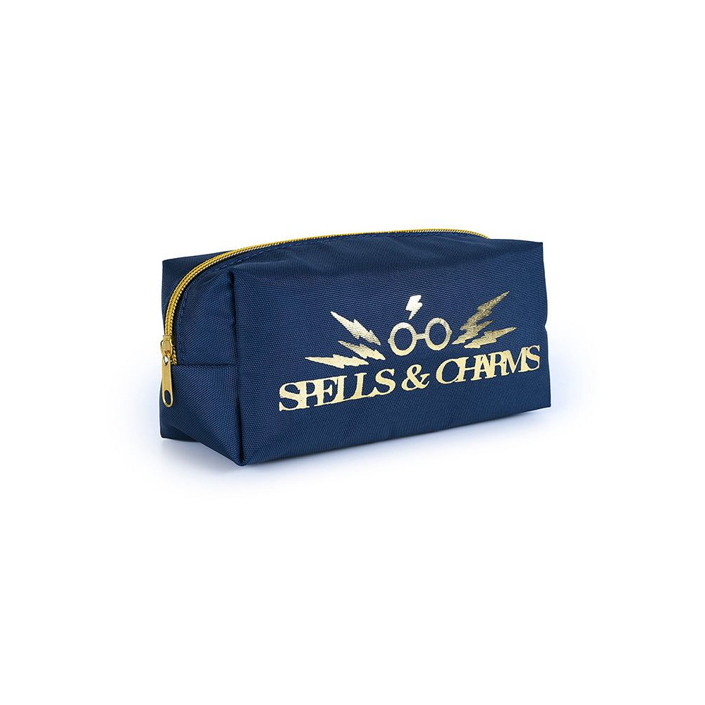 Tmavě modrý penál se zlatým zipem a nápisem "Spells and Charms" - Kouzla a čáry. K uložení všech magických per a tužek.