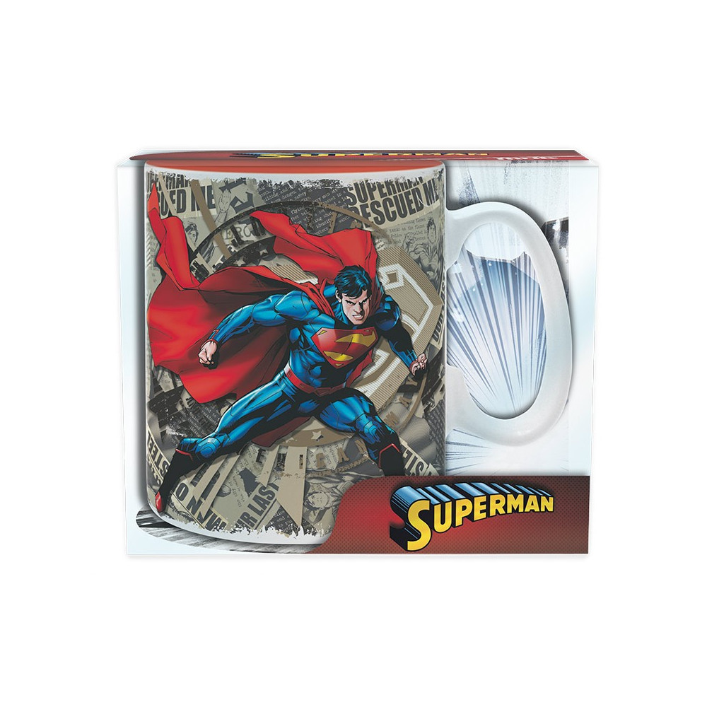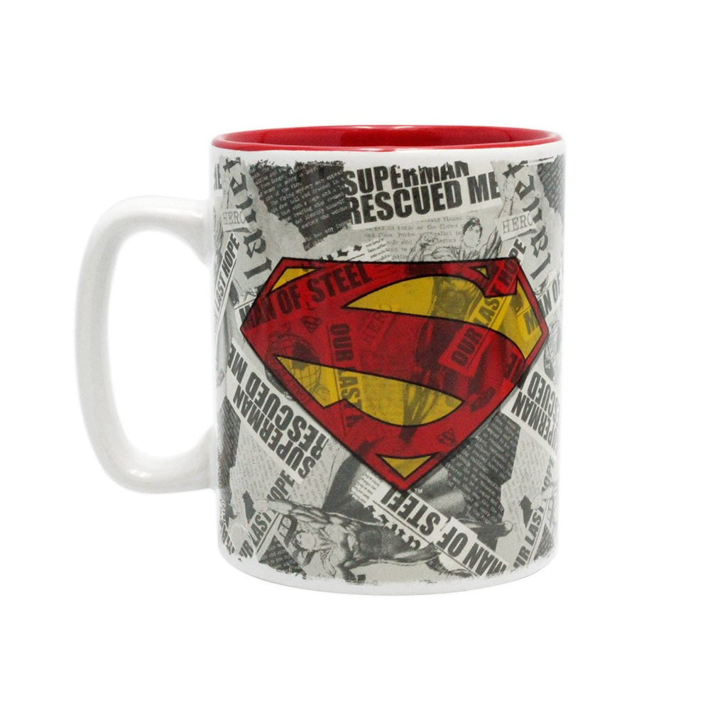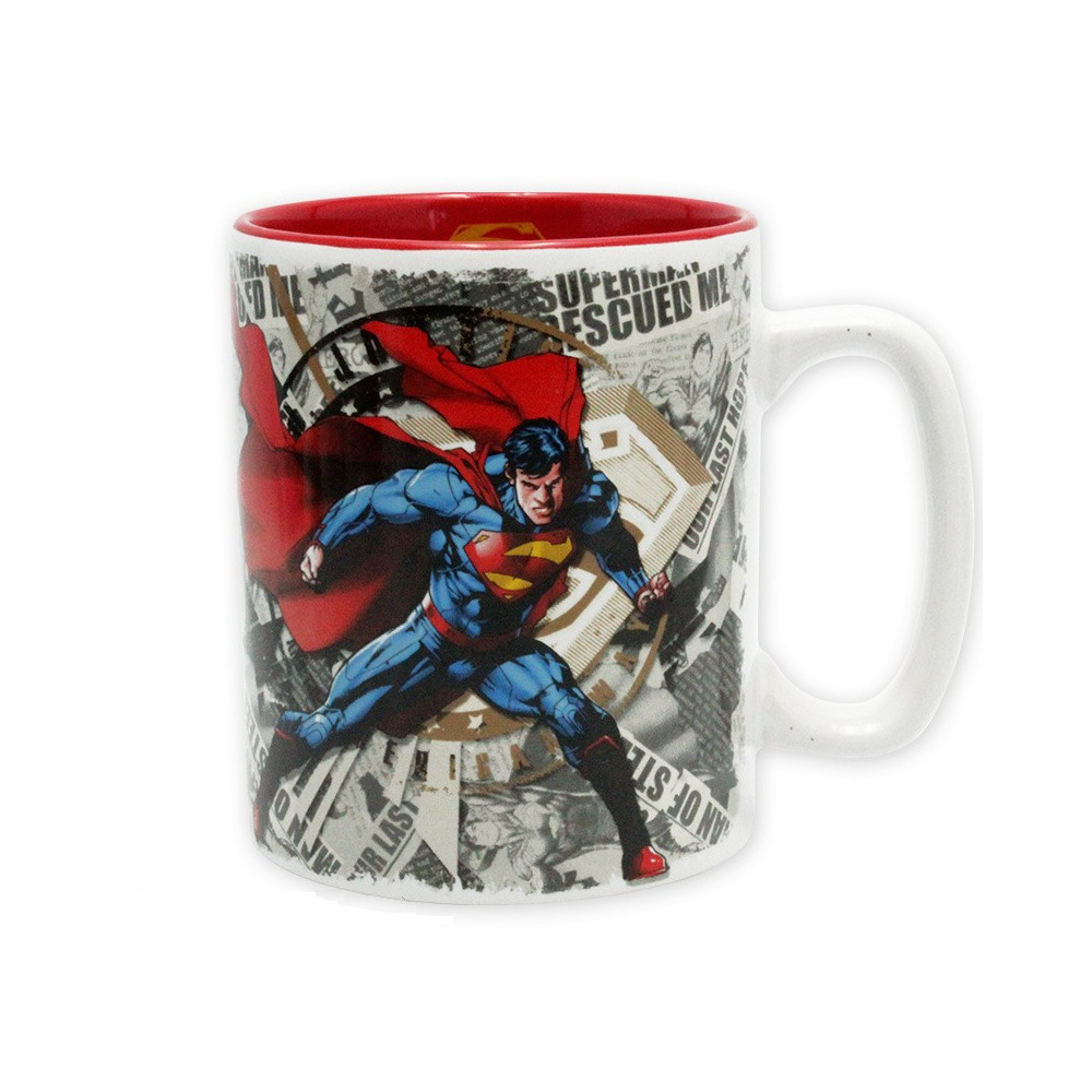 Design hrnku dominuje ikonický Superman ve svém klasickém červeno-modrém kostýmu, obklopený komiksovými výstřižky a symbolem „S“ – znakem naděje. Tento velkoobjemový hrnek je skvělý pro všechny, kdo si ráno chtějí dát pořádnou porci hrdinské motivace.