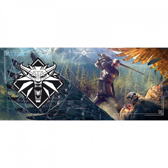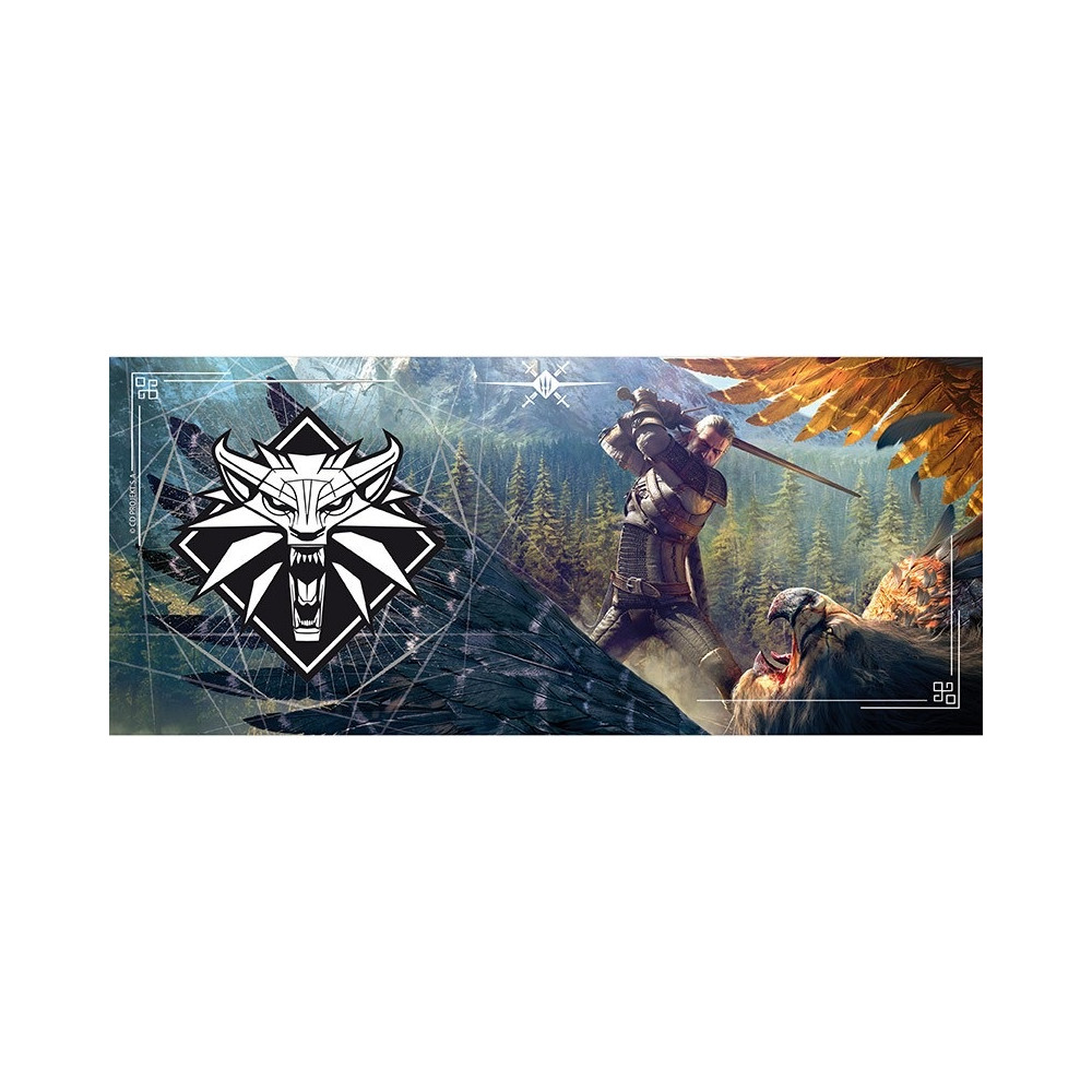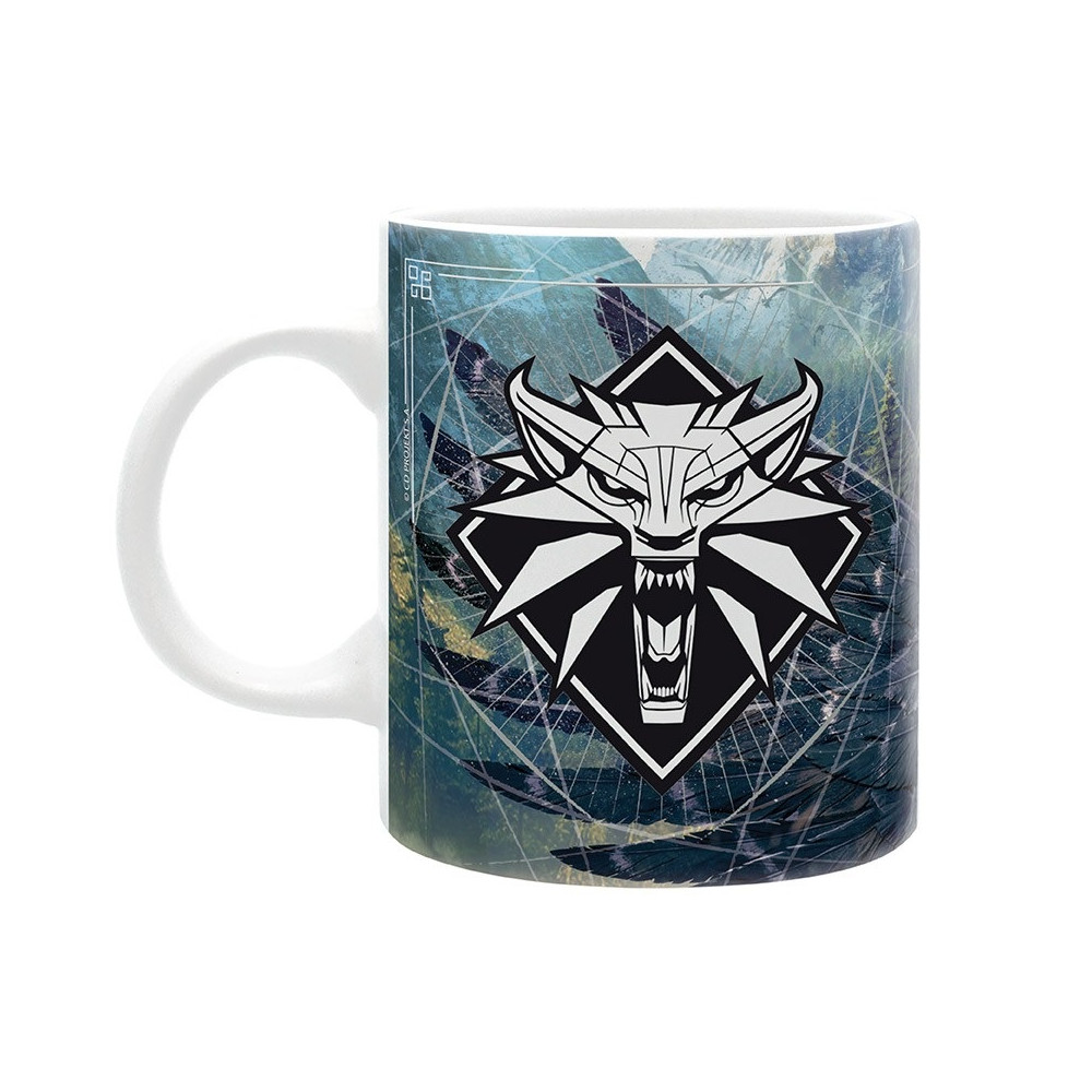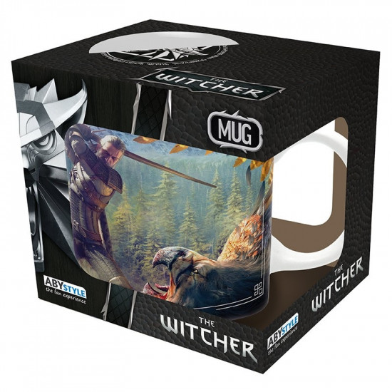 Na hrnku dominuje Geralt z Rivie v plném boji proti nebezpečnému Griffinu, s lesnatou krajinou Kontinentu v pozadí. Celý motiv doplňuje bílý znak vlčí školy – symbol zaklínačské cti a dovednosti. Detailní grafika v živých barvách dodává hrnku napětí a sílu.