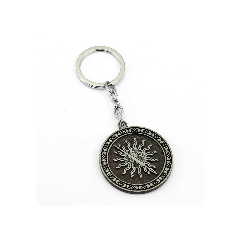 Stříbrná klíčenka Tyrell – precizní erb slunce s kopím jako znak cti a krásy, ideální pro fanoušky Hry o trůny a sběratele šlechtických symbolů.