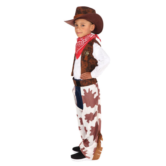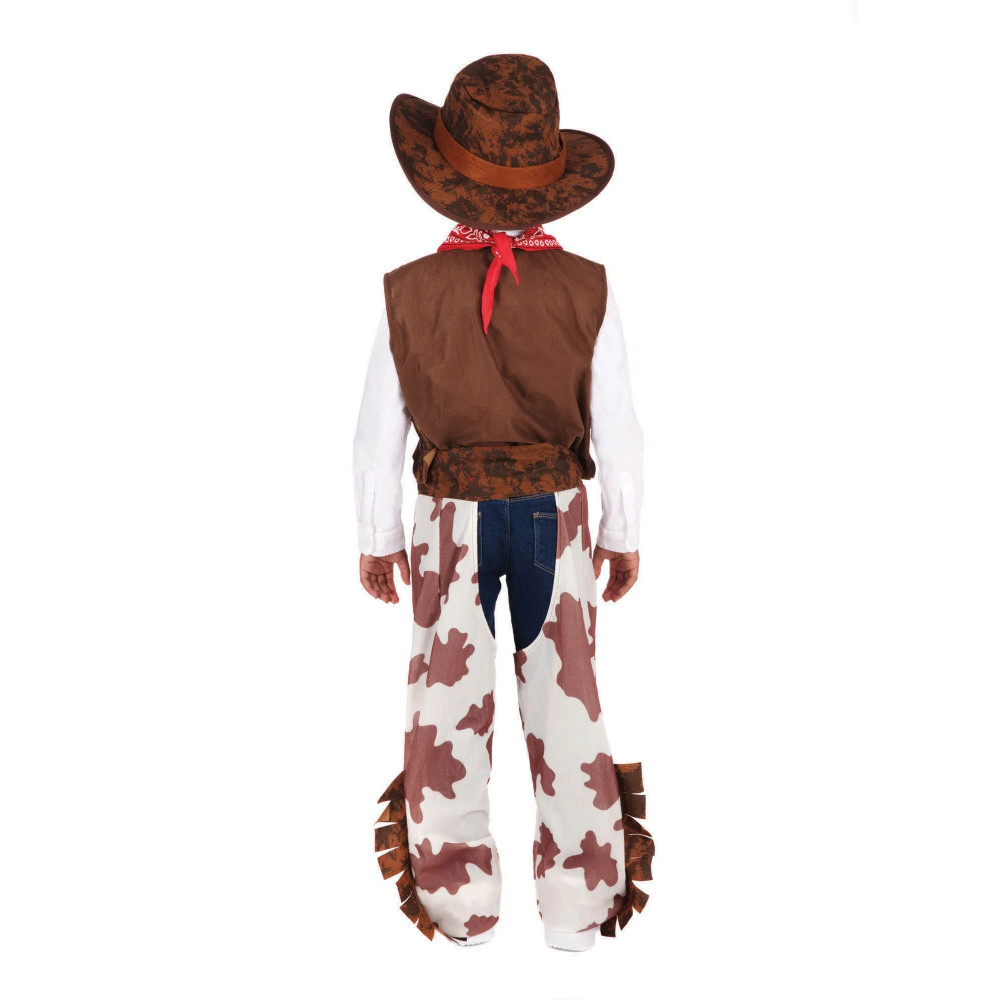Kostým je inspirován klasickým westernovým stylem – nechybí kovbojský klobouk, stylová vesta, šátek kolem krku ani kalhoty s typickým vzorem. Celý outfit působí autenticky a zároveň je pohodlný, takže si vaše dítě může užívat zábavu bez omezení.