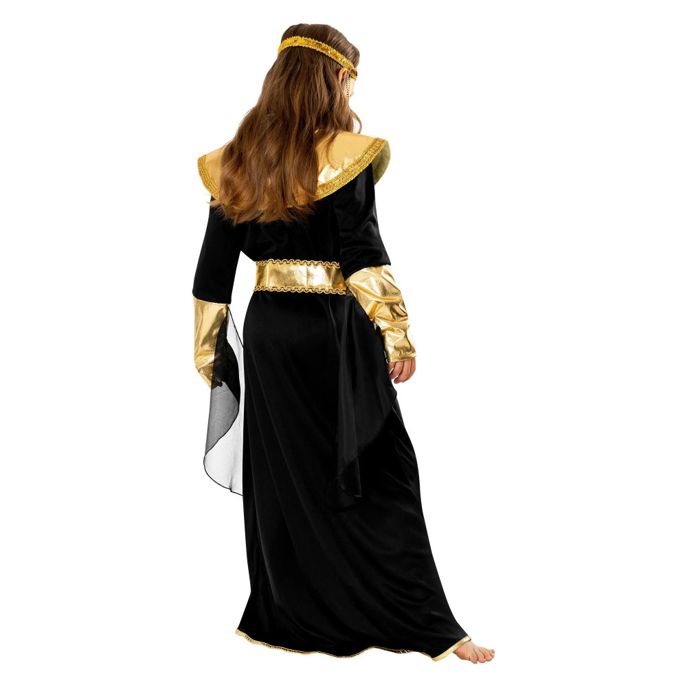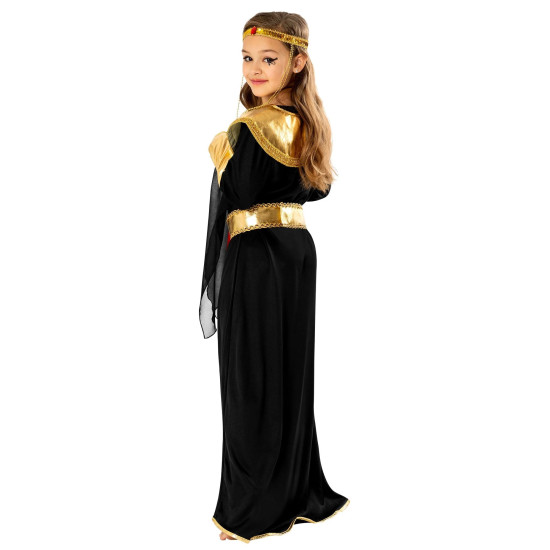 Tento nádherný kostým v černo-zlatém provedení je inspirován legendární egyptskou panovnicí. Bohatě zdobený límec, třpytivé zlaté detaily a výrazný dekorativní pás s barevnými kameny vytváří luxusní vzhled, ve kterém se vaše dítě bude cítit sebevědomě a výjimečně.
