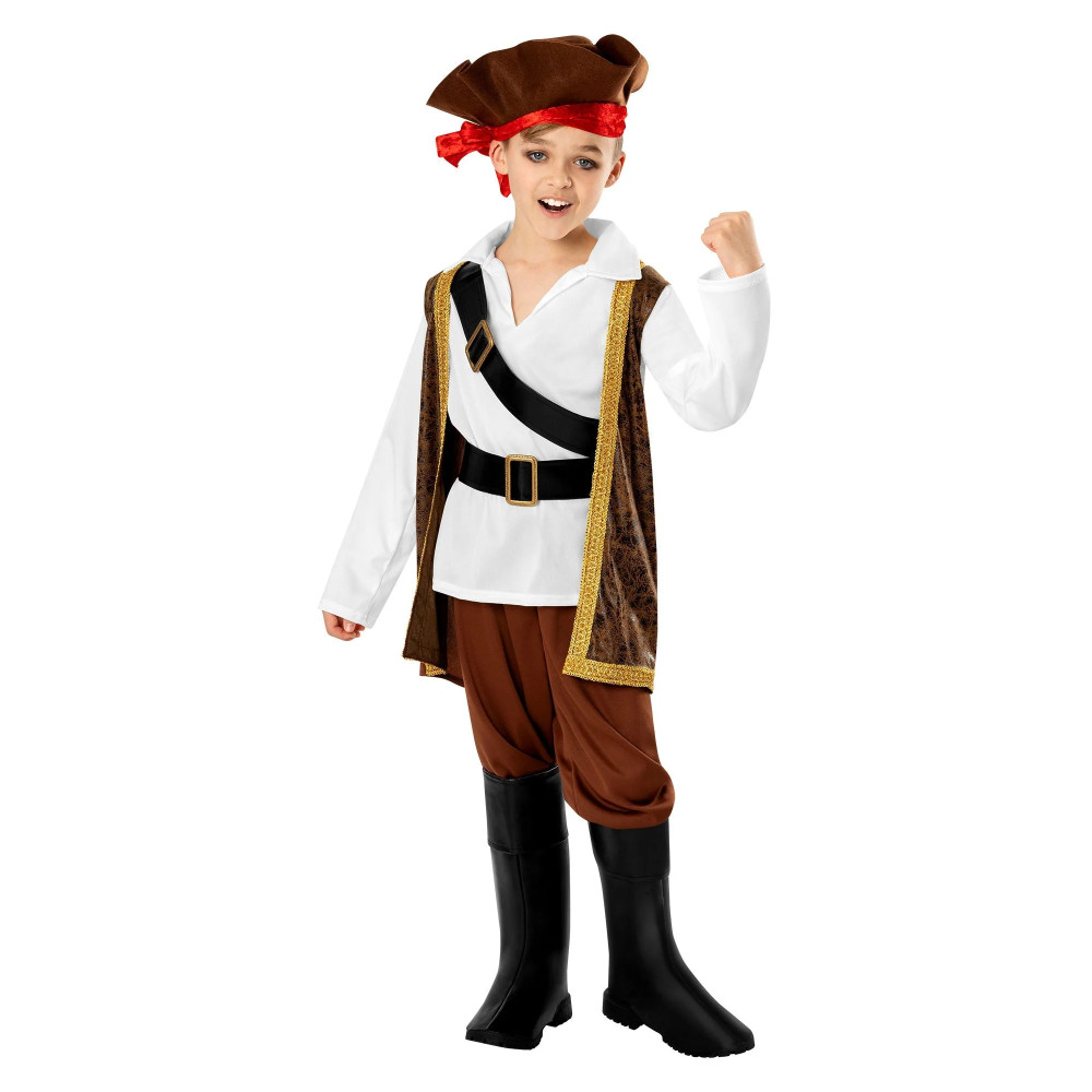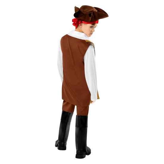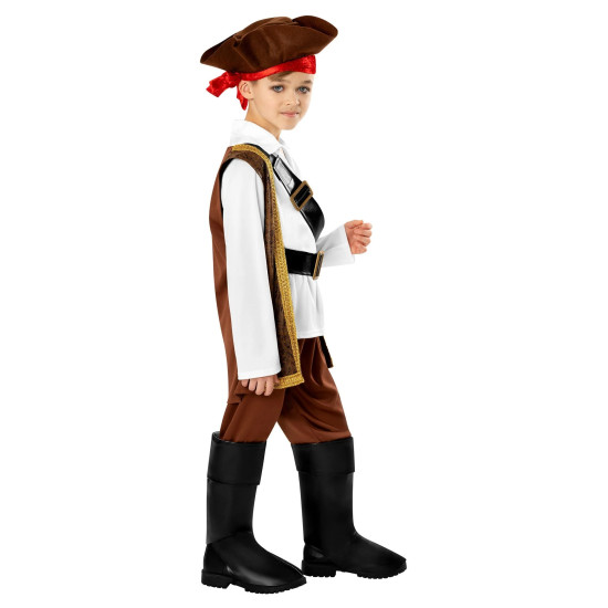Kostým je laděn do klasického pirátského stylu – bílá košile, hnědá vesta se zlatým lemováním, černý pásek s přezkou a typický pirátský klobouk s červeným šátkem. Celkový vzhled doplňují kalhoty a vysoké návleky na boty, které dodávají autentický nádech skutečného mořského vlka.