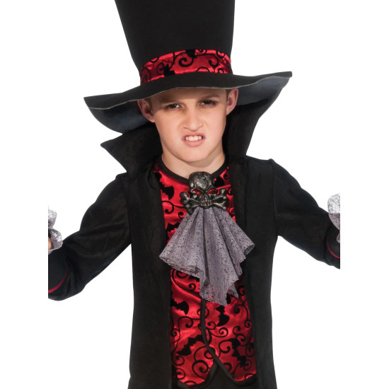 Kostým zaujme propracovanými detaily v černo-červeném provedení, výrazným límcem a impozantním vysokým kloboukem. Elegantní kombinace saka s všitou vestou a ozdobným jabotem dodává kostýmu aristokratický vzhled skutečného pána noci.