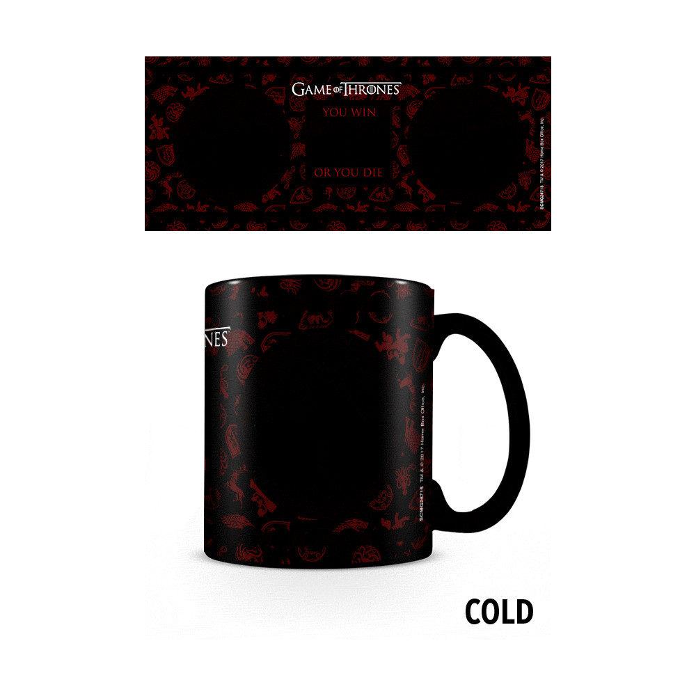 Na první pohled černý hrnek skrývá symbol tříhlavého draka rodu Targaryen, který se objeví po zalití horkým nápojem. Design doplňuje slavný výrok „You win or you die“, který odráží drsná pravidla tohoto epického světa.