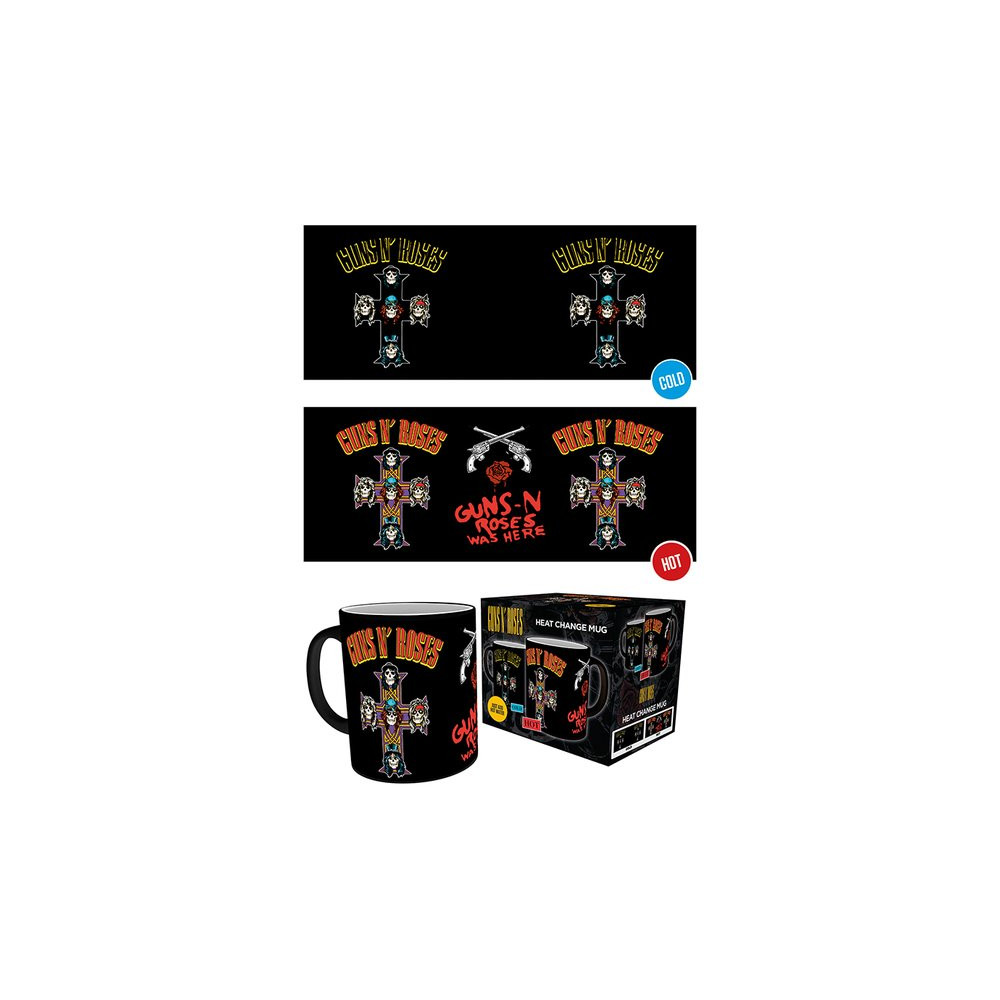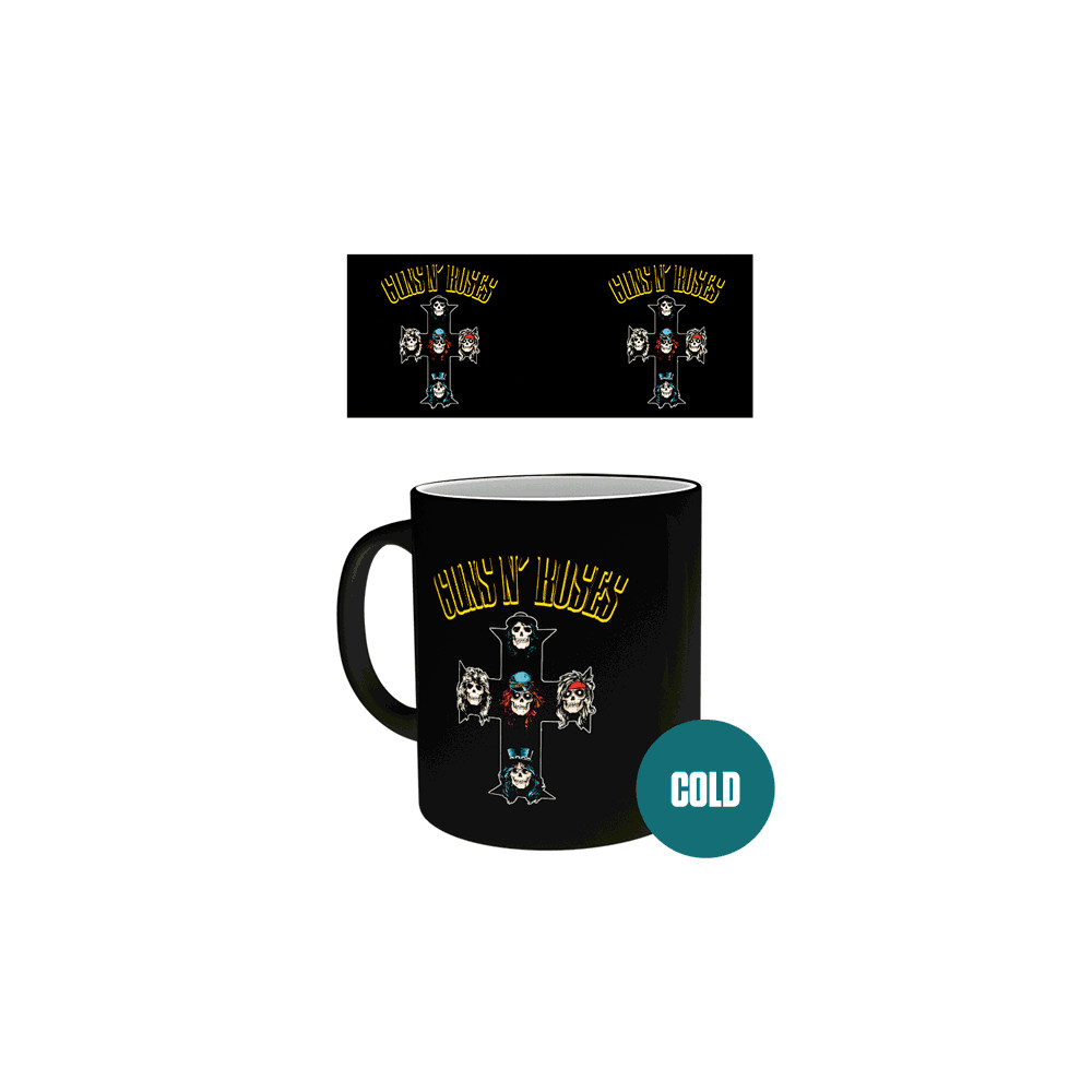 Na první pohled černý hrnek se známým logem kapely odhalí po zalití horkým nápojem barevnou grafiku slavného alba „Appetite for Destruction“, včetně ikonického kříže s lebkami členů kapely a červeného nápisu „Guns N' Roses Was Here“.