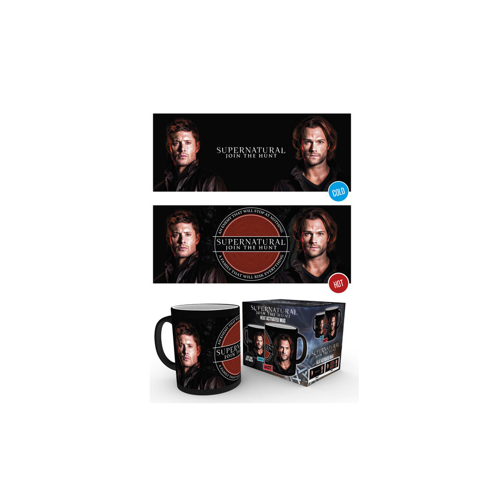 Stylový hrnek Supernatural s motivem „Join the Hunt“ a portréty Sama a Deana, které se objeví po zalití horkým nápojem. Pro fanoušky seriálu.