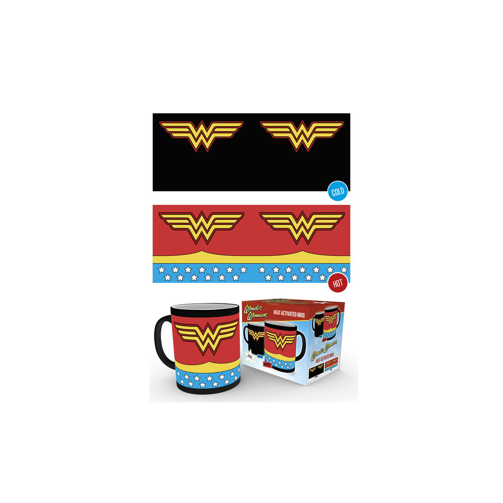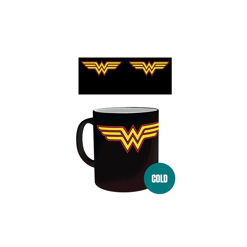 Na první pohled decentní černý hrnek s logem Wonder Woman v teplých odstínech žluté a červené. Jakmile do něj nalijete horký nápoj, odhalí se barevný kostým Wonder Woman – červený top, modrá část se hvězdami a žlutý pás. Skvělý vizuální efekt, který potěší každého fanouška DC Comics.