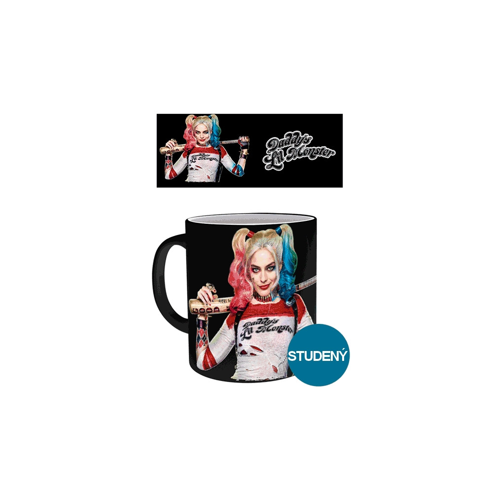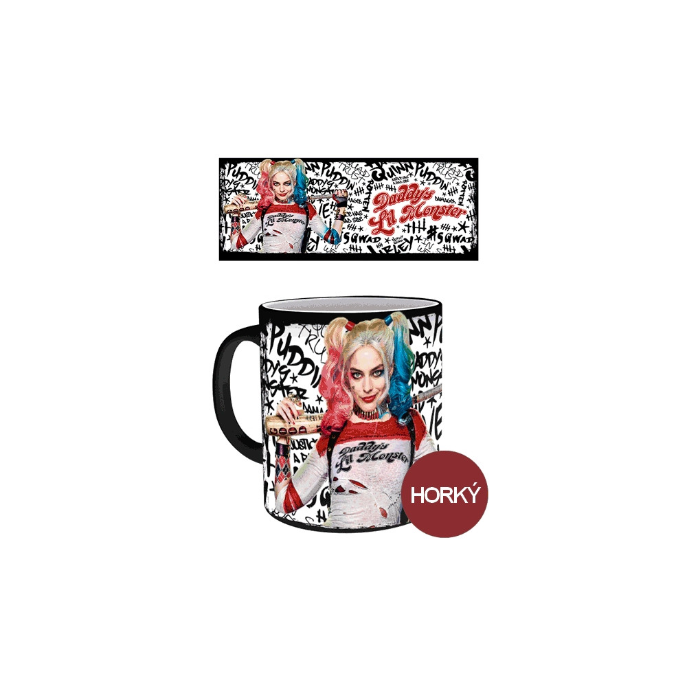 Stylový hrnek Harley Quinn z filmu Sebevražedný oddíl, který mění barvu! Po zalití horkým nápojem odhalí pestrobarevné graffiti pozadí s ikonickým nápisem „Daddy's Lil Monster“. Ideální dárek pro fanoušky DC Comics.
