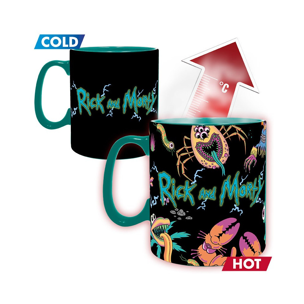 V chladném stavu uvidíte jen minimalistický design s Rickem a Mortym v lodi na černém pozadí. Jakmile se hrnek zahřeje, celý se promění – objeví se barevný výjev plný podivných mimozemšťanů, monster a psychedelických prvků typických pro svět Ricka a Mortyho. Každé ráno tak začne pořádnou dávkou šílenství!