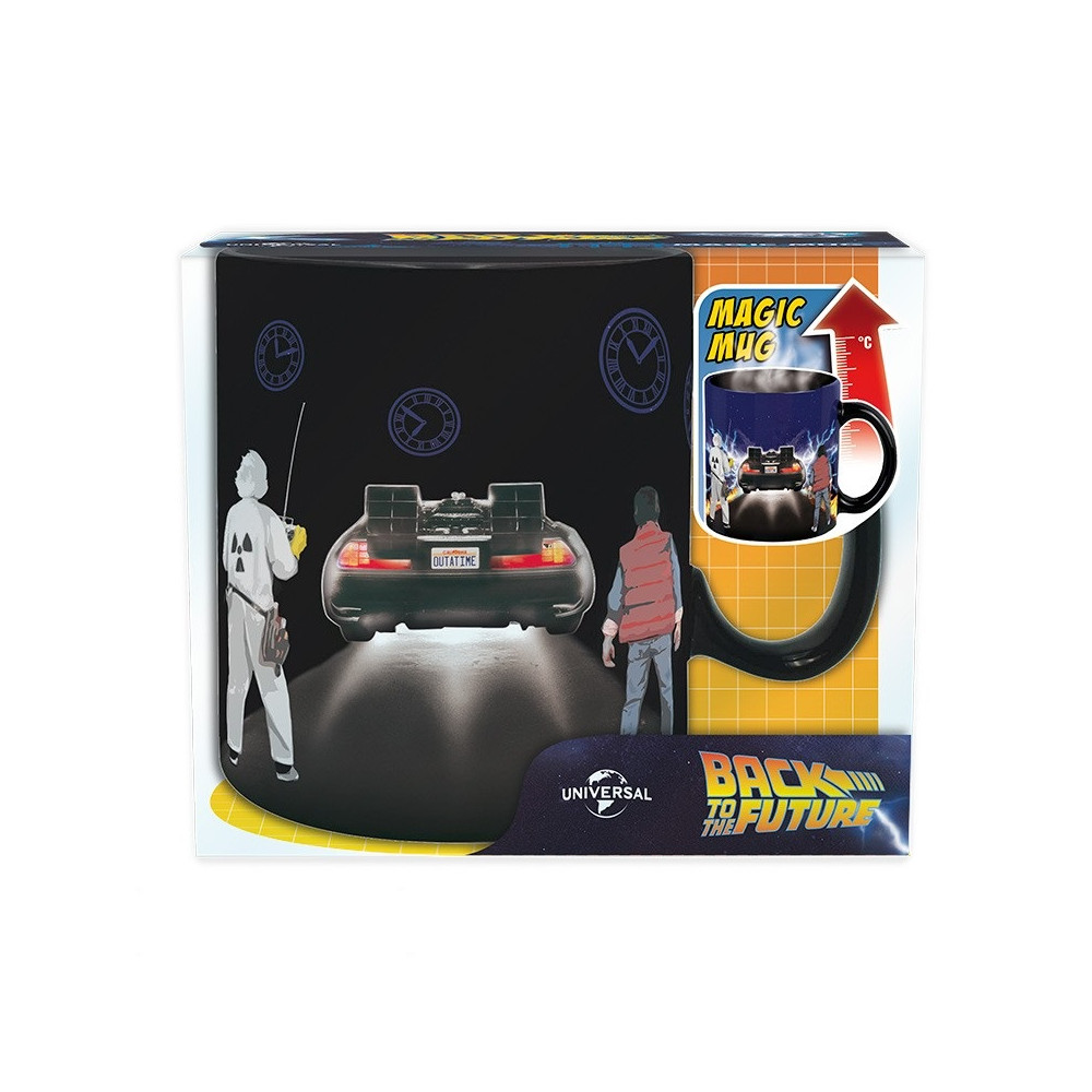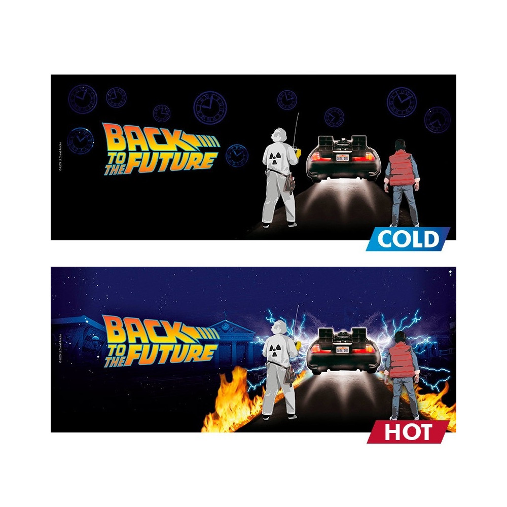 V chladném stavu hrnek ukazuje decentní černý design s logem a siluetami postav. Jakmile do něj nalijete horký nápoj, odhalí se plná scéna – DeLorean připravený ke skoku v čase, efekty výboje energie a siluety hlavních hrdinů v plné barvě. Nechybí ani hořící stopy pneumatik a hvězdné nebe v pozadí.