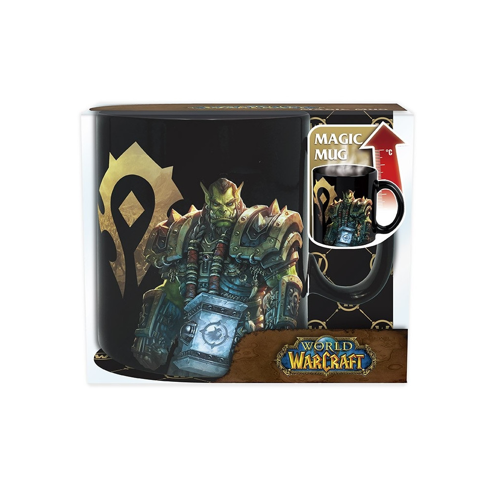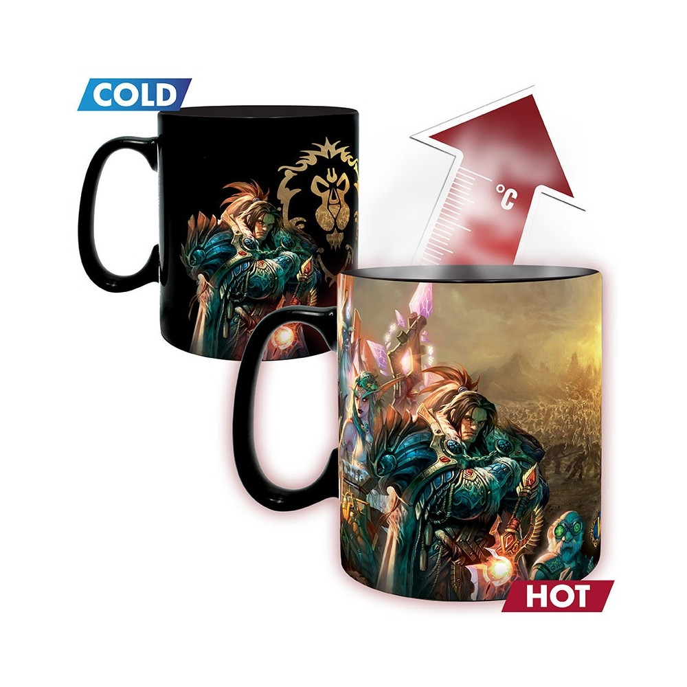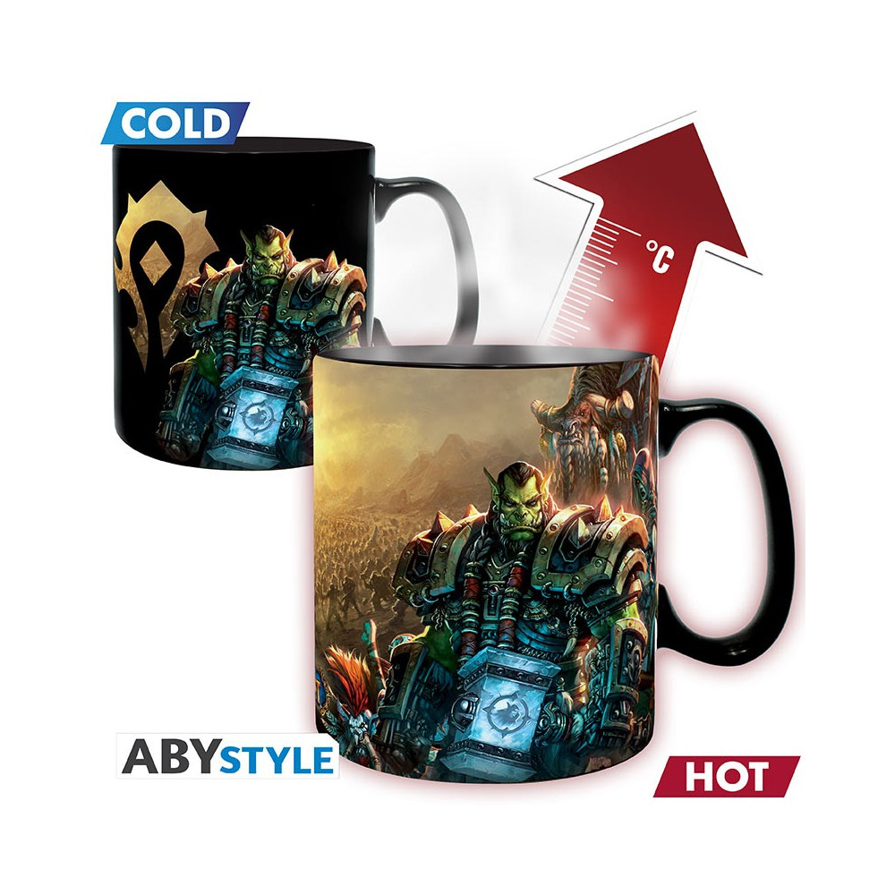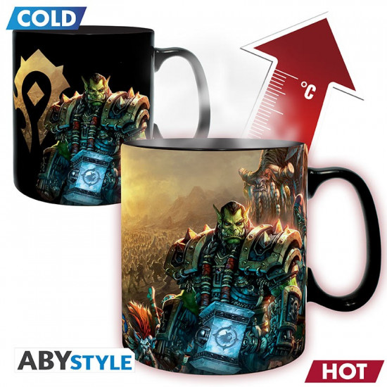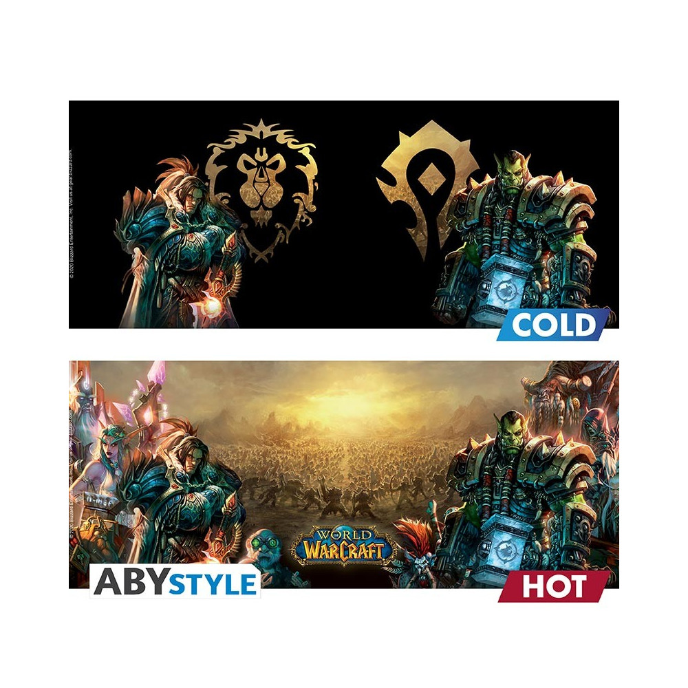 V chladném stavu hrnek ukazuje emblémy Hordy a Aliance spolu s temně laděnými postavami obou táborů. Po zalití horkým nápojem se však promění v epickou bitevní scénu – detailní ilustrace hrdinů obou stran, světelná magie a napětí bitvy o Azeroth. Každý doušek vás vtáhne do boje.