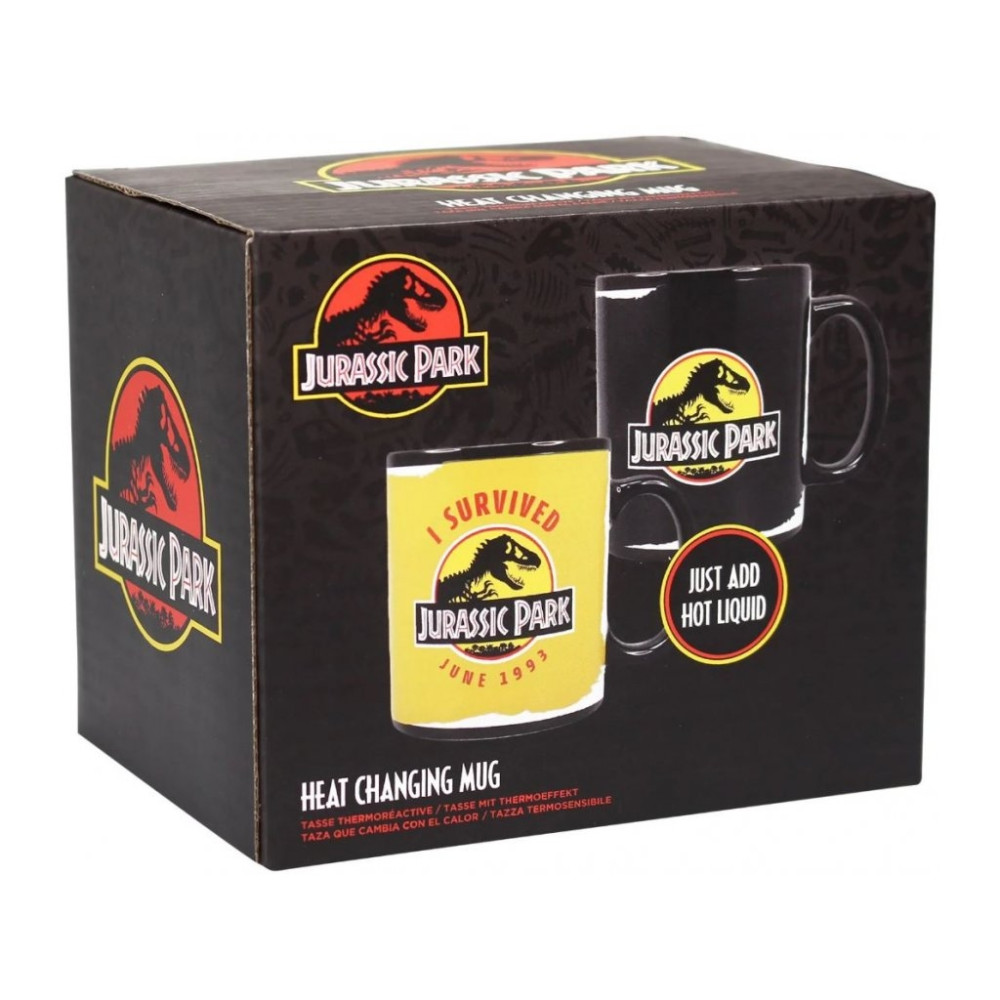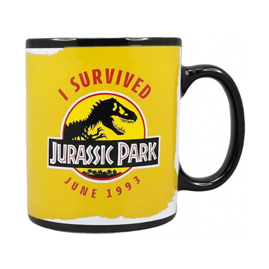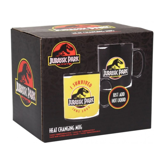 V chladném stavu hrnek zobrazuje známé logo Jurassic Park na černém pozadí. Po zalití horkou vodou se odhalí barevný nápis „I SURVIVED Jurassic Park - June 1993“ na žlutém podkladu – odkazující na premiéru slavného filmu. Tento vizuální efekt vás nadchne pokaždé, když si připravíte svůj oblíbený čaj nebo kávu.