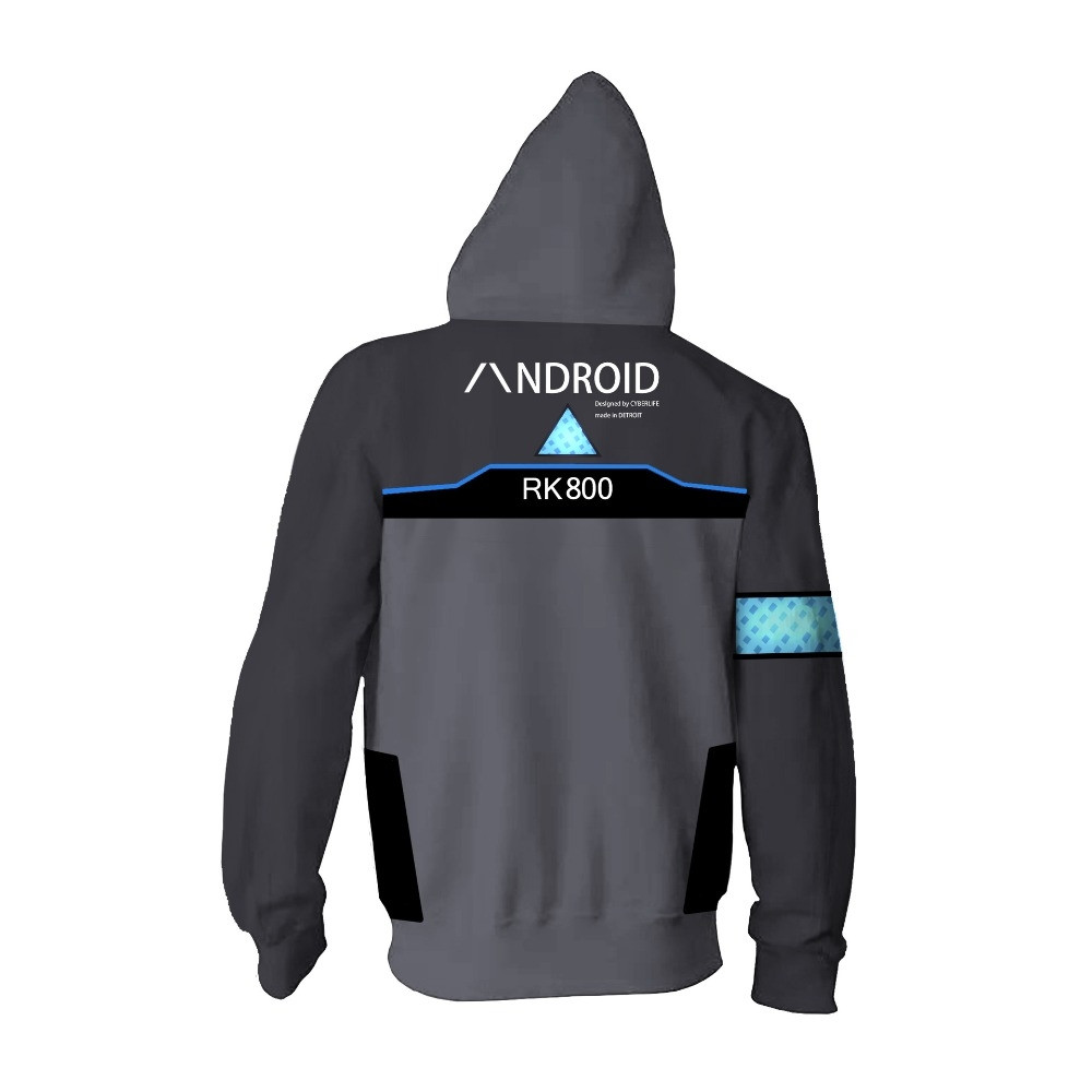 Temná šedá mikina s futuristickým vzhledem androida RK800 – detailní potisk, modré LED prvky a nápisy inspirované hrou