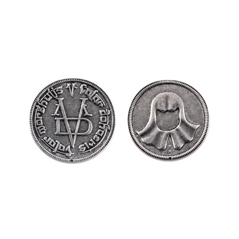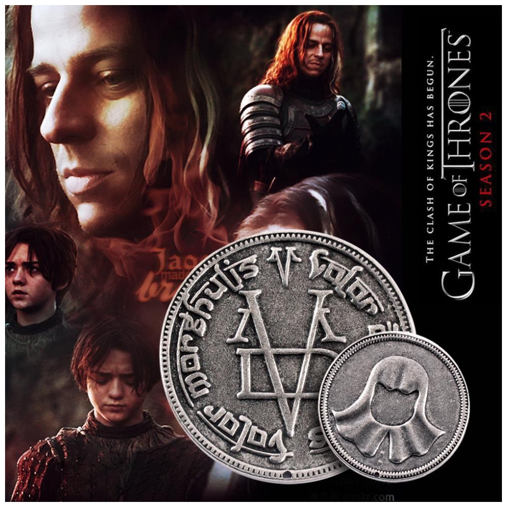 Mince Hra o trůny - Muž bez tváře je oboustranný talisman, který dostala Arya od neznámého muže, jehož osvobodila ze zajetí. Pokud prý Arya donese minci do Barvosu a řekne slova Valar Morghulis, tak si ji muž brzy najde.