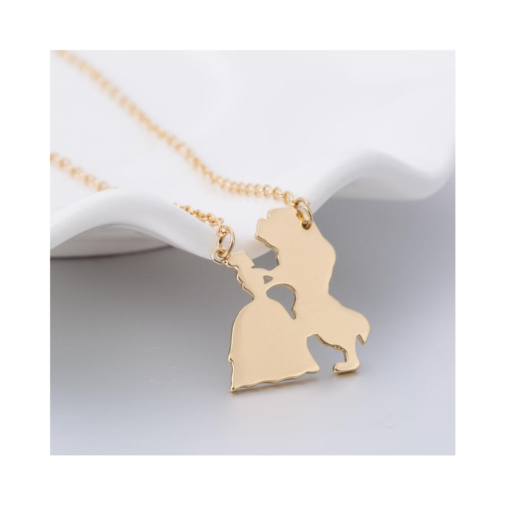 Elegantní zlatý náhrdelník s obrysem páru z pohádky Kráska a zvíře. Stylový šperk s jemným řetízkem o délce 45 cm. Vhodný jako romantický dárek pro fanoušky Disney nebo milovníky klasických příběhů.