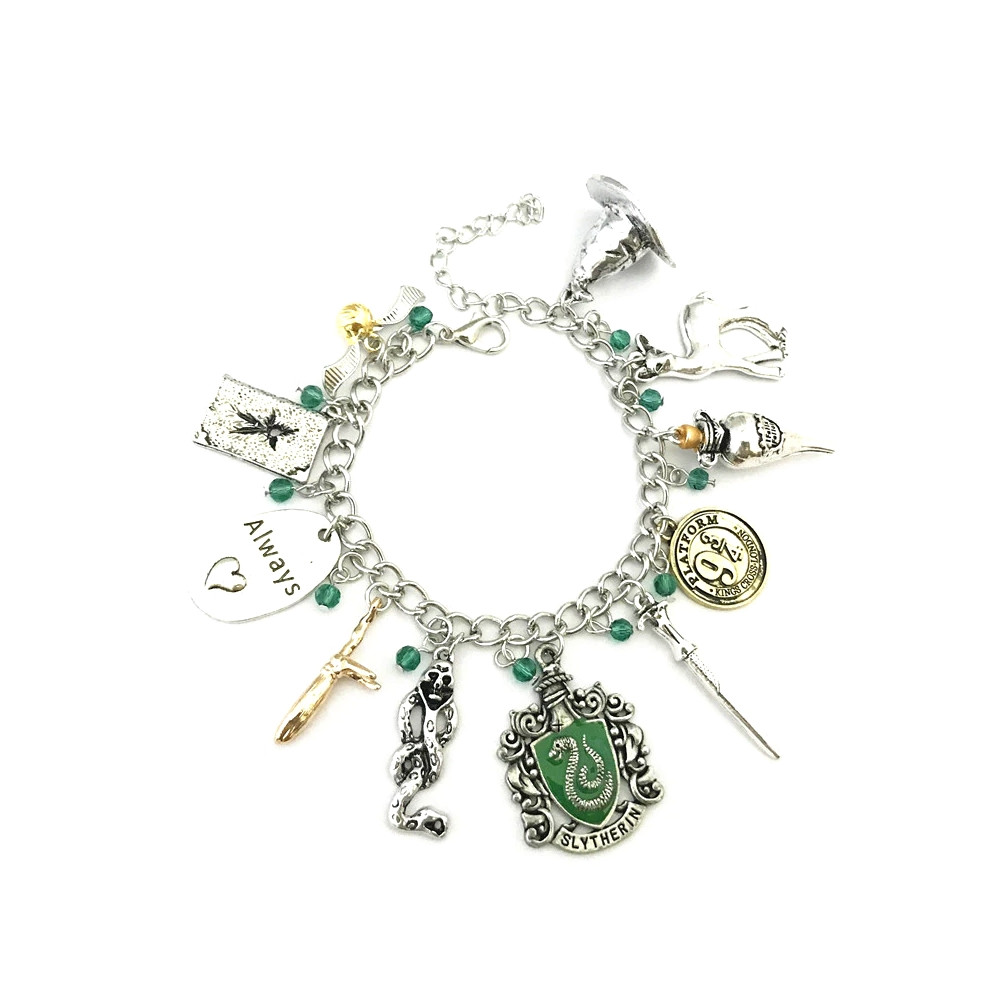 Bohatě zdobený charms náramek obsahuje symbol Zmijozelu, relikvie smrti, hůlku, zlatonku, hady, erb koleje a další ikonické prvky světa Harryho Pottera. Elegantní řetízkový základ doplňují drobné zelené korálky.