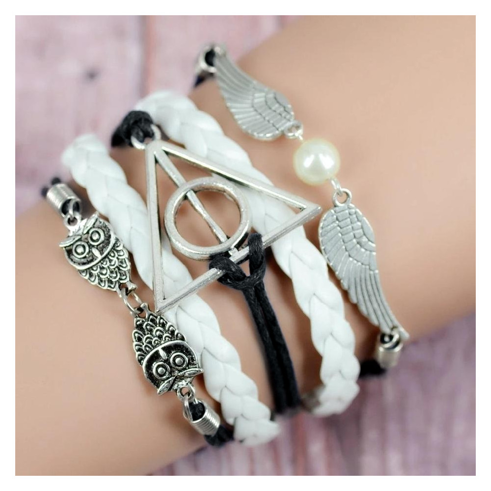 Stylový Harry Potter náramek s relikviemi smrti, sovičkami a perlou. Elegantní doplněk pro fanoušky magie i každodenní nošení.