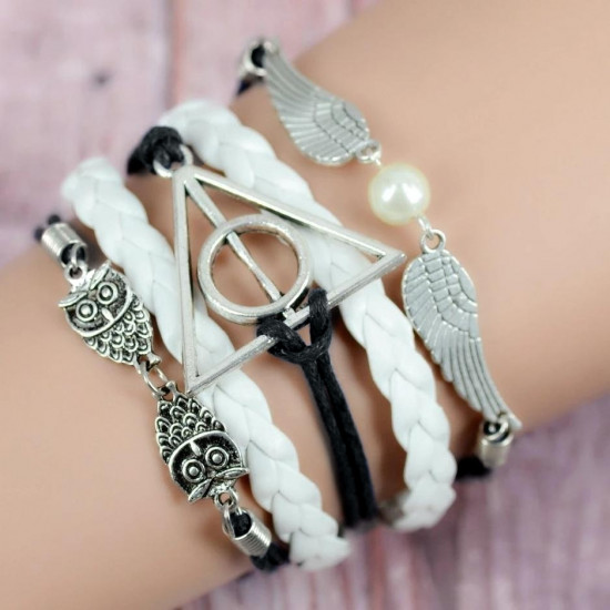 Náramek tvoří pletené kožené pásky v bílé a černé barvě doplněné o stříbrné prvky – relikvie smrti, sovičky, andělská křídla a perla, které vytvářejí elegantní a zároveň výrazný doplněk.