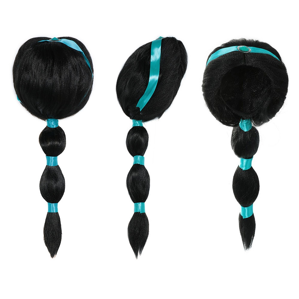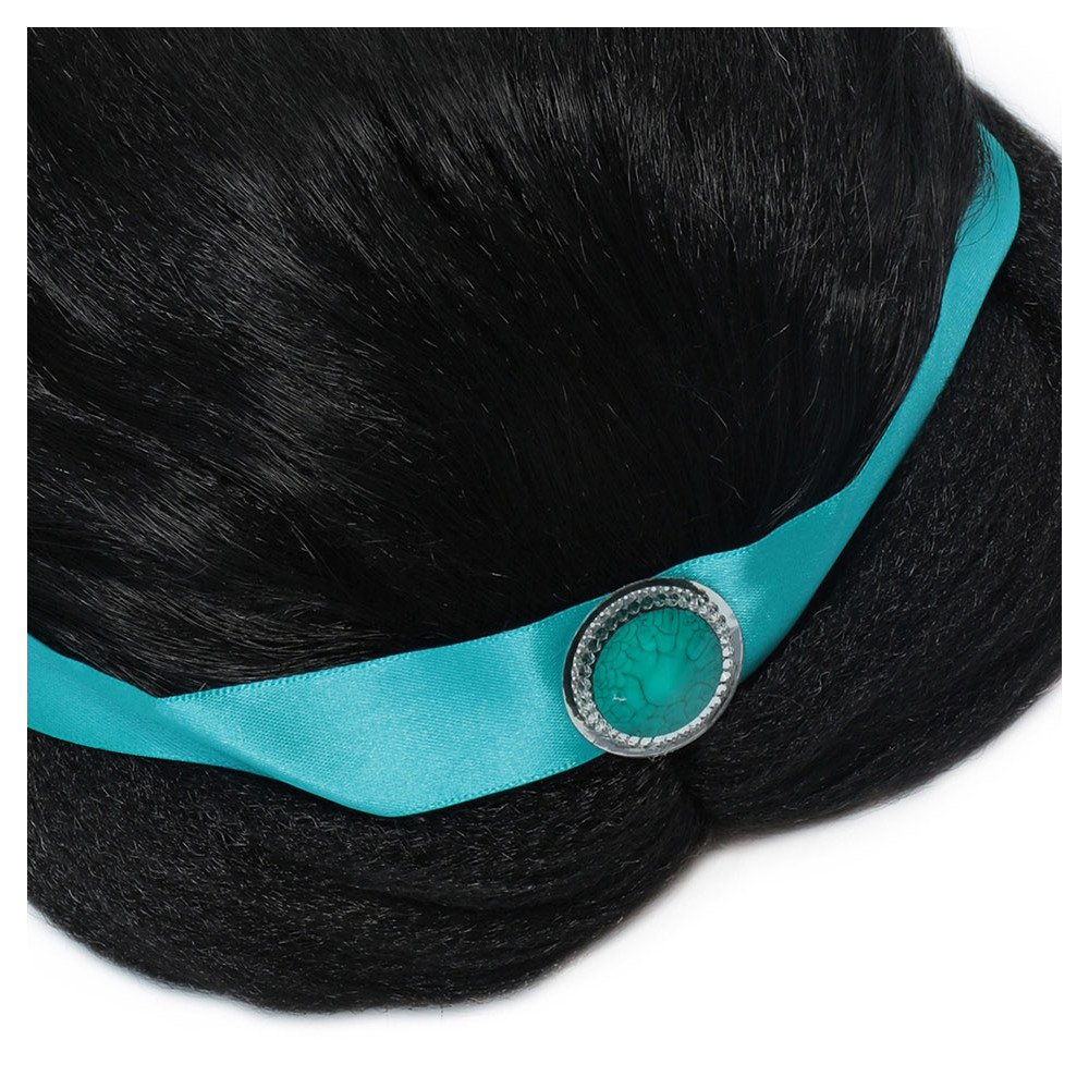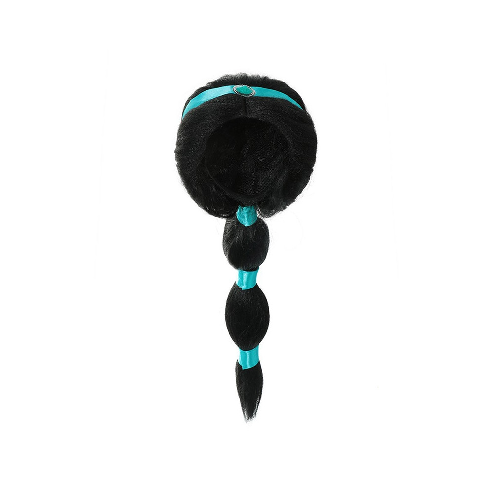 Paruka princezny Jasmíny pro děti 3–6 let. Elegantní černý cop s tyrkysovými detaily, ideální ke kostýmu z pohádky Aladin.