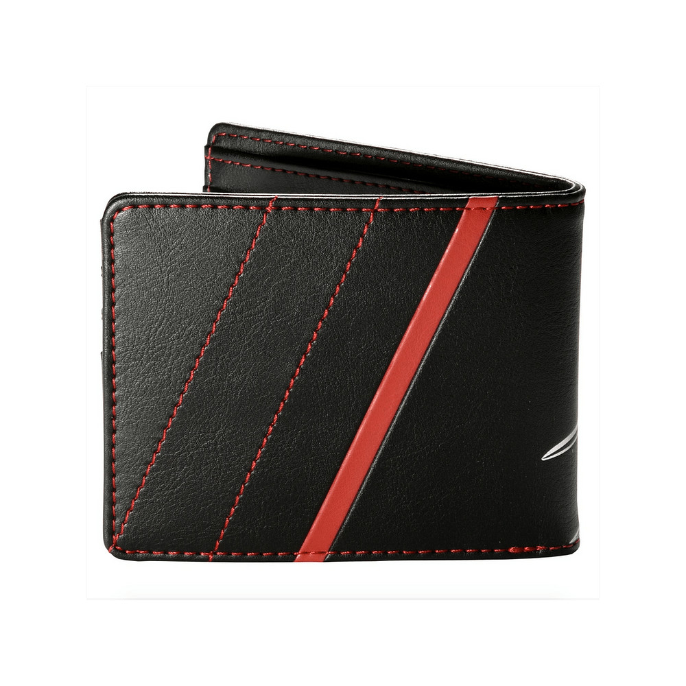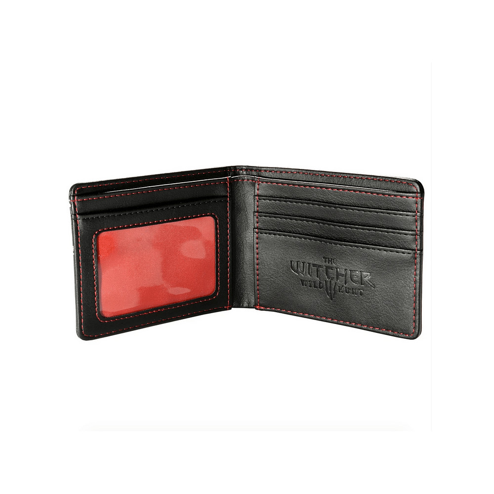 Přední strana peněženky zdobena výrazným symbolem zaklínačského medailonu a runami. Stylové červené prošití podtrhuje kontrastní černo-červenou barevnost. -