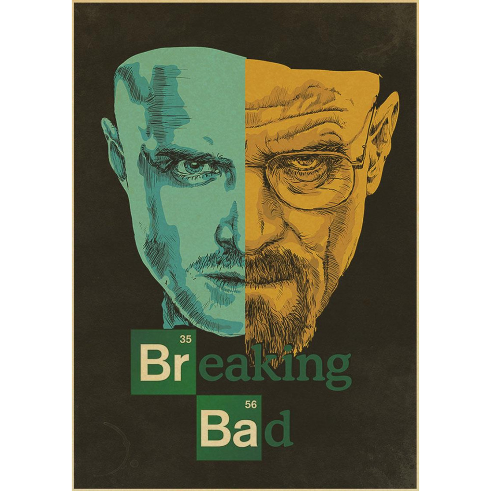 Stylový plakát Breaking Bad (42 × 30 cm) spojuje Waltera Whitea a Jesseho Pinkmana v jedinečné půlené ilustraci – perfektní dekorace pro fanoušky napětí a proměny charakteru.