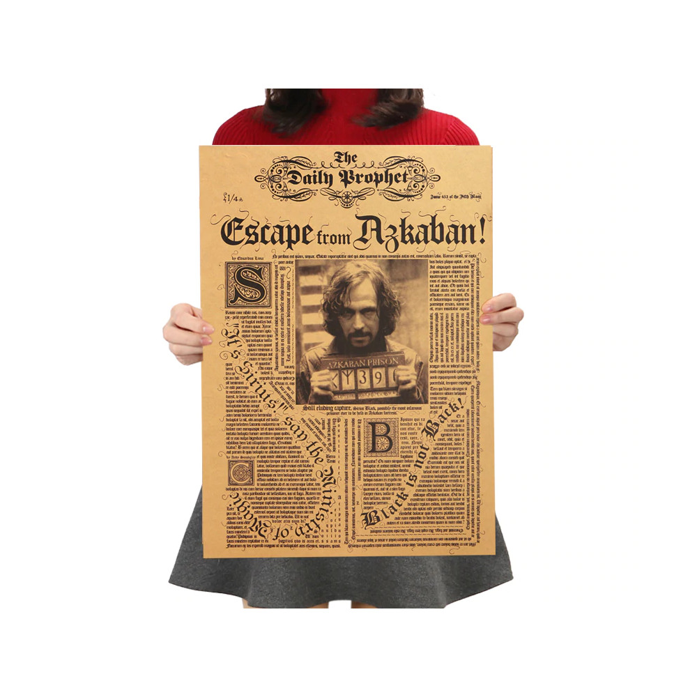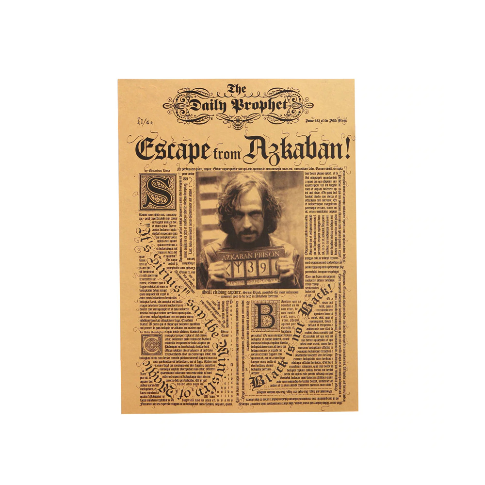Plakát s novinovou titulní stranou Daily Prophet oznamující útěk Siriuse Blacka z Azkabanu je povinnou výbavou pro fanoušky světa Harryho Pottera.