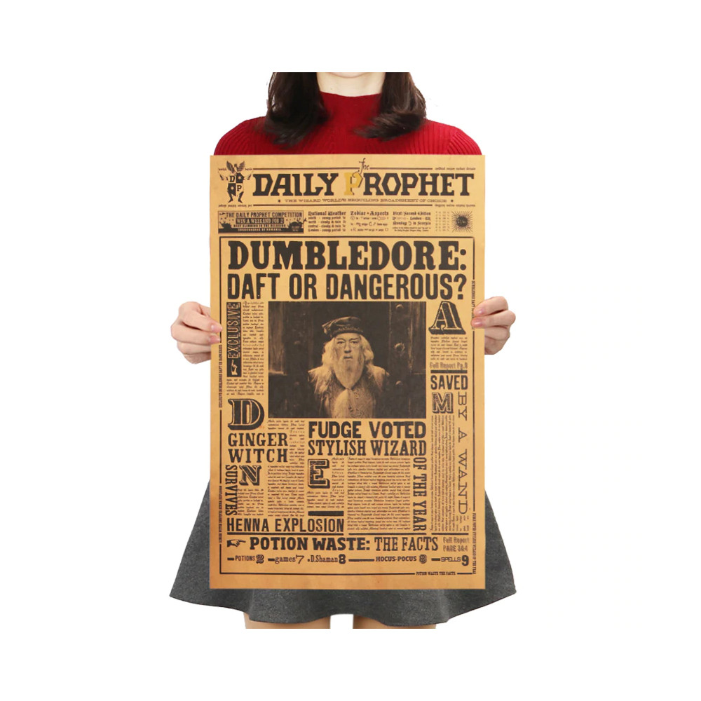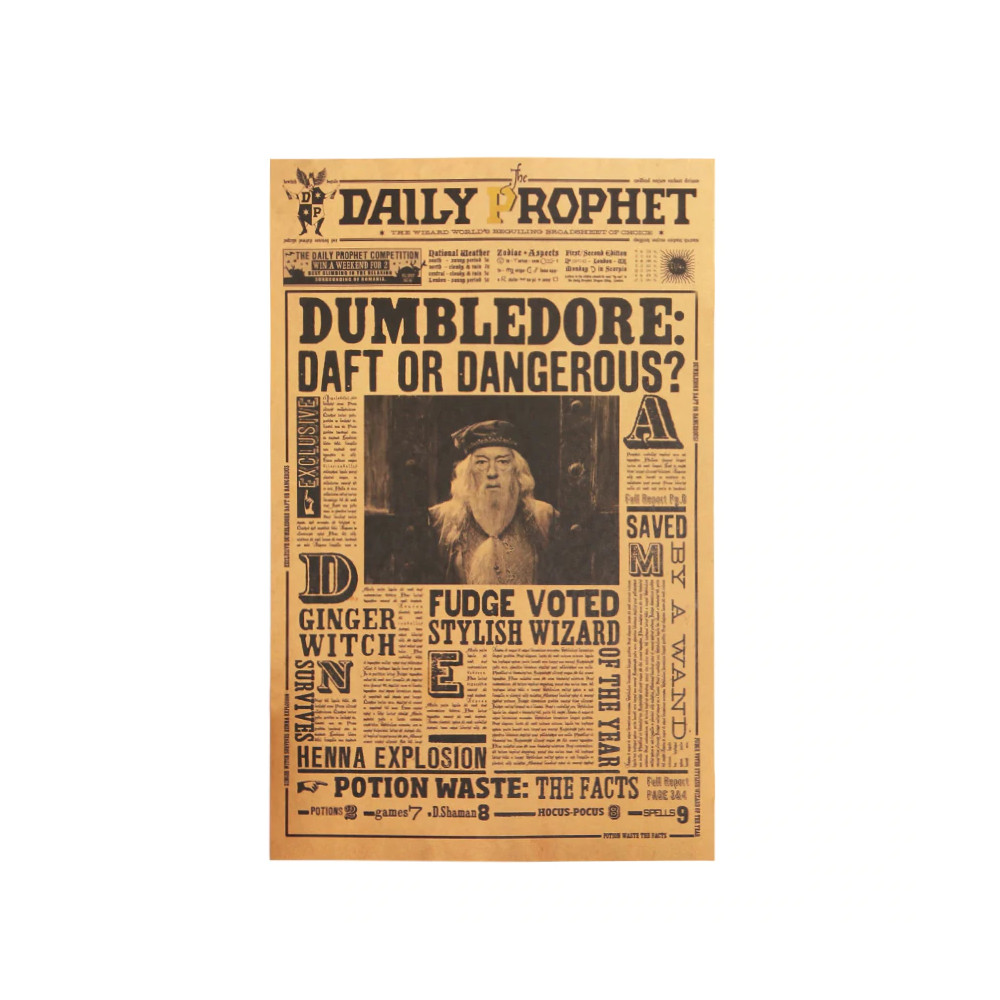 Plakát Harry Potter – Albus Brumbál: zmatený nebo nebezpečný? představuje dramatickou titulní stranu novin Daily Prophet, která zpochybňuje důvěryhodnost jednoho z největších čarodějů všech dob. Výrazná grafika a stylizace do podoby dobových kouzelnických novin dělá z tohoto plakátu skutečný sběratelský kousek.