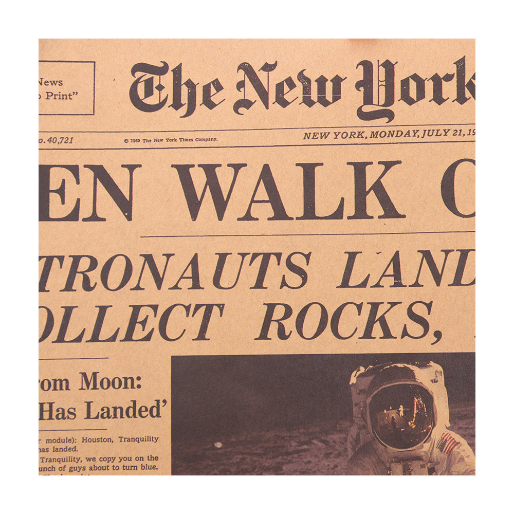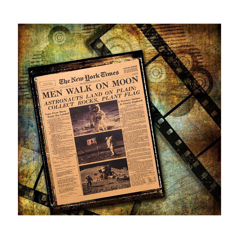 Autentický vzhled vintage novin v kombinaci s černobílými fotografiemi a nadpisem „Men Walk on Moon“ vytváří působivý dekorativní prvek pro každého fanouška vesmíru, historie nebo retro stylu.