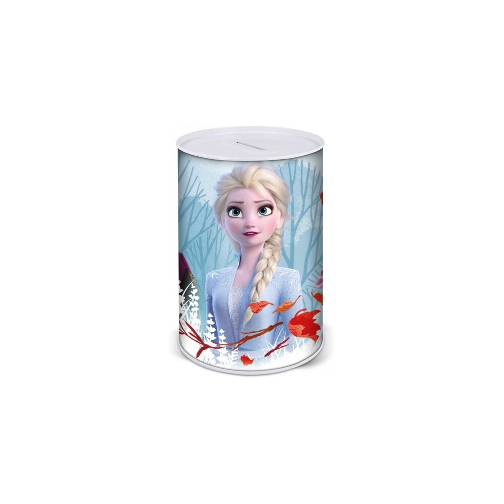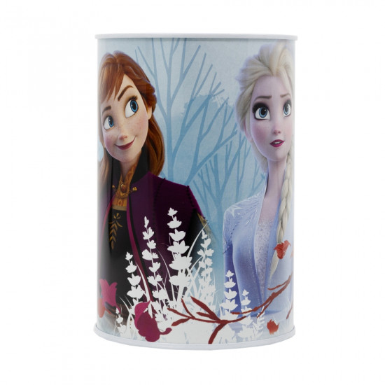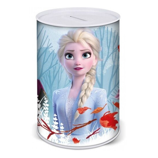 Velká plechová pokladnička s motivem Ledové království - Frozen. Kasičku zdobí obrázky princezen Elsy a Anny a sněhuláka Olafa. Tato kasička má výhodu, že se dá otevřít pouze jednou za pomocí běžného otvíráku na konzervy. Dítě se tedy k naspořeným mincím dostane pouze pod kontrolu dospělé osoby. Rozměry pokladničky jsou: výška 15 cm, průměr 10 cm.