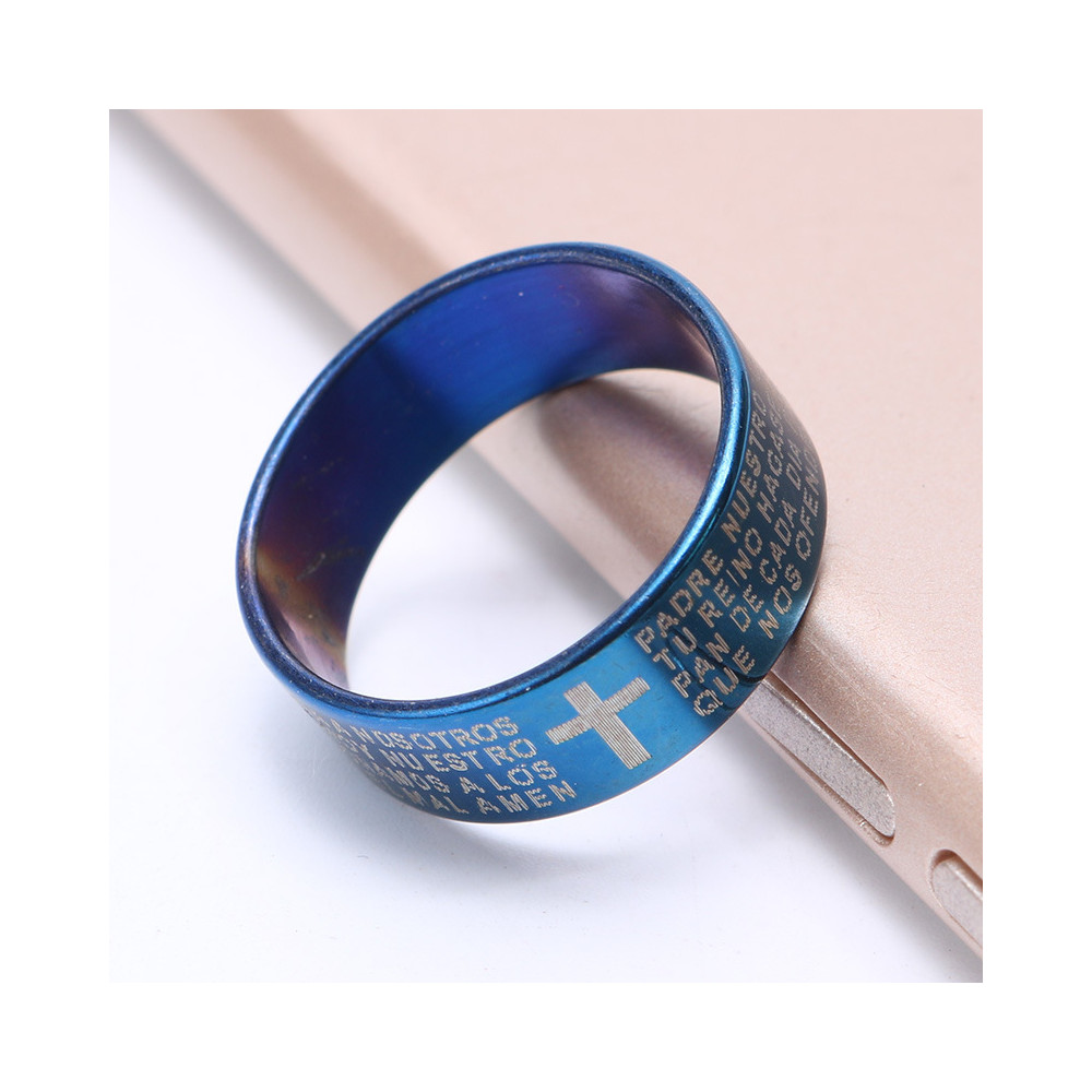 Vyrobený z kvalitní nerezové oceli, tento prsten má elegantní modrý povrch a je ozdoben jemnou rytinou modlitby Otčenáš ve španělštině, doplněnou výrazným křížem. Odolný a stylový – ideální pro každodenní nošení i jako smysluplný dárek.