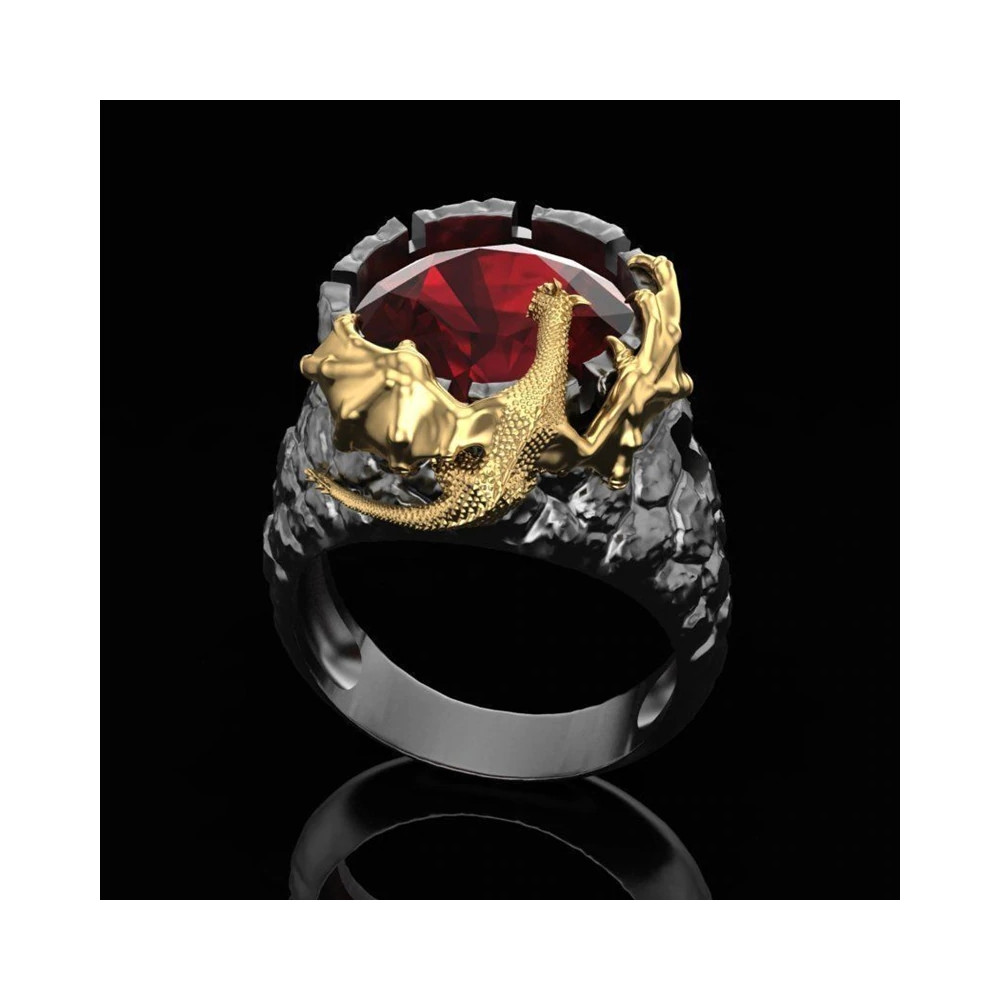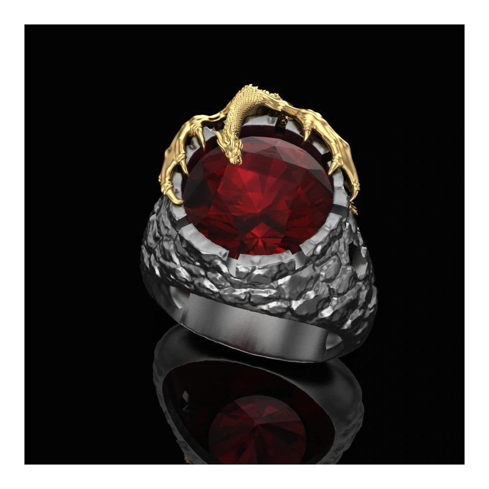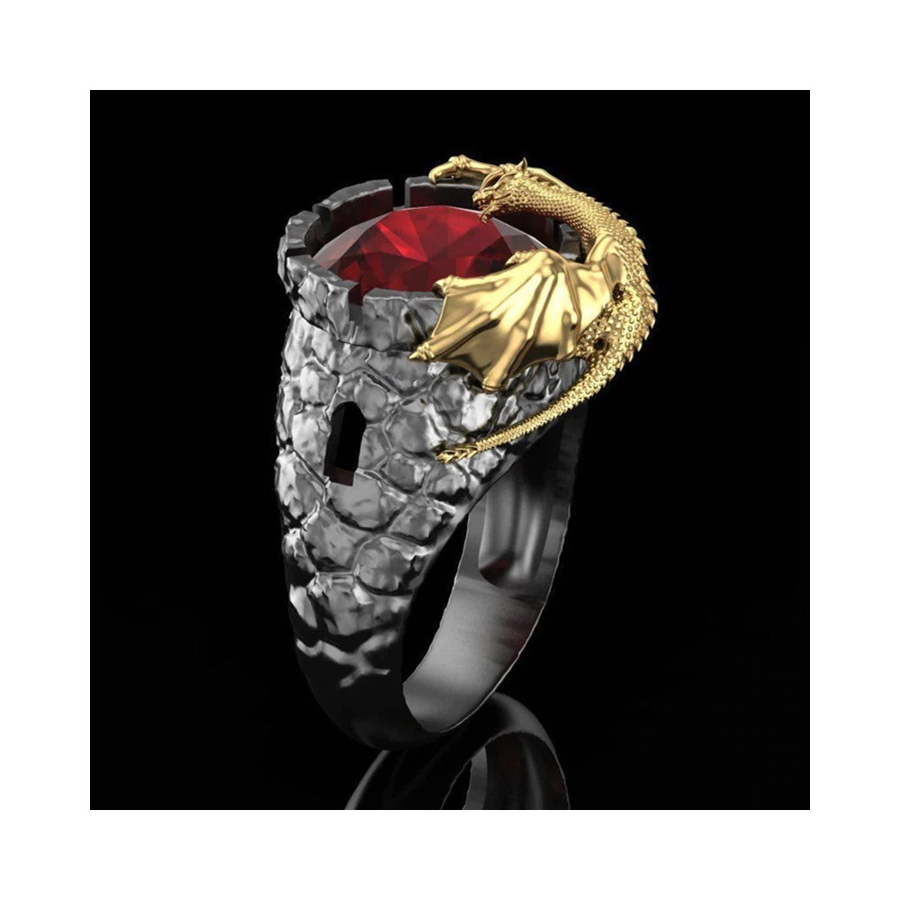 Prsten kombinuje dramatický rudý kámen zasazený do masivního podstavce s detailně propracovaným zlatým drakem, který se kolem něj vine jako strážce prastaré magie. Celkové provedení zaujme luxusním kontrastem a majestátní estetikou.
