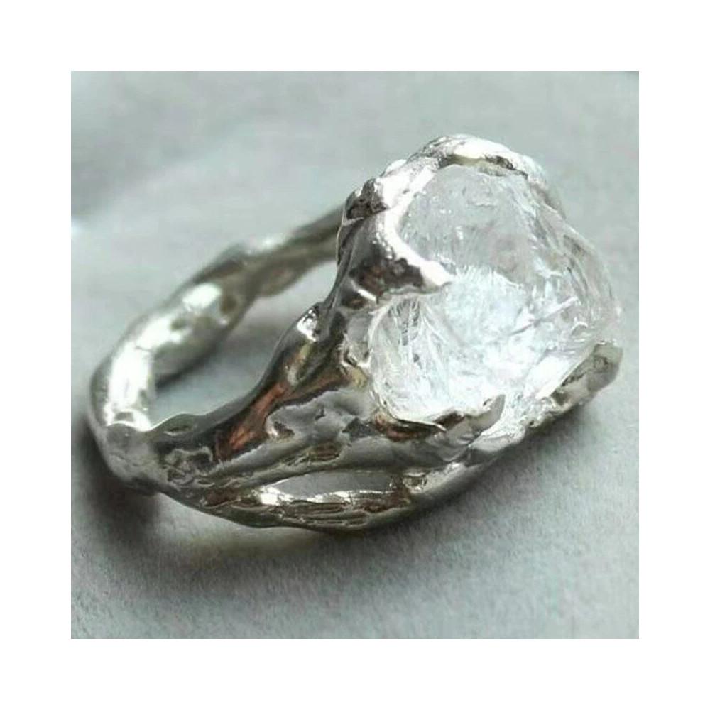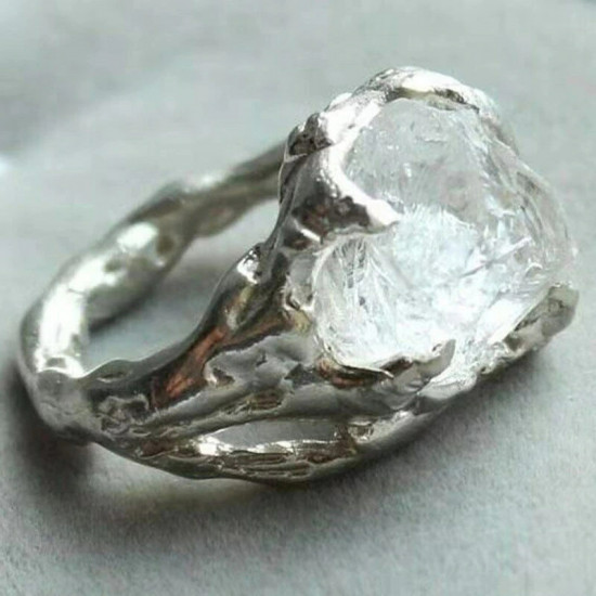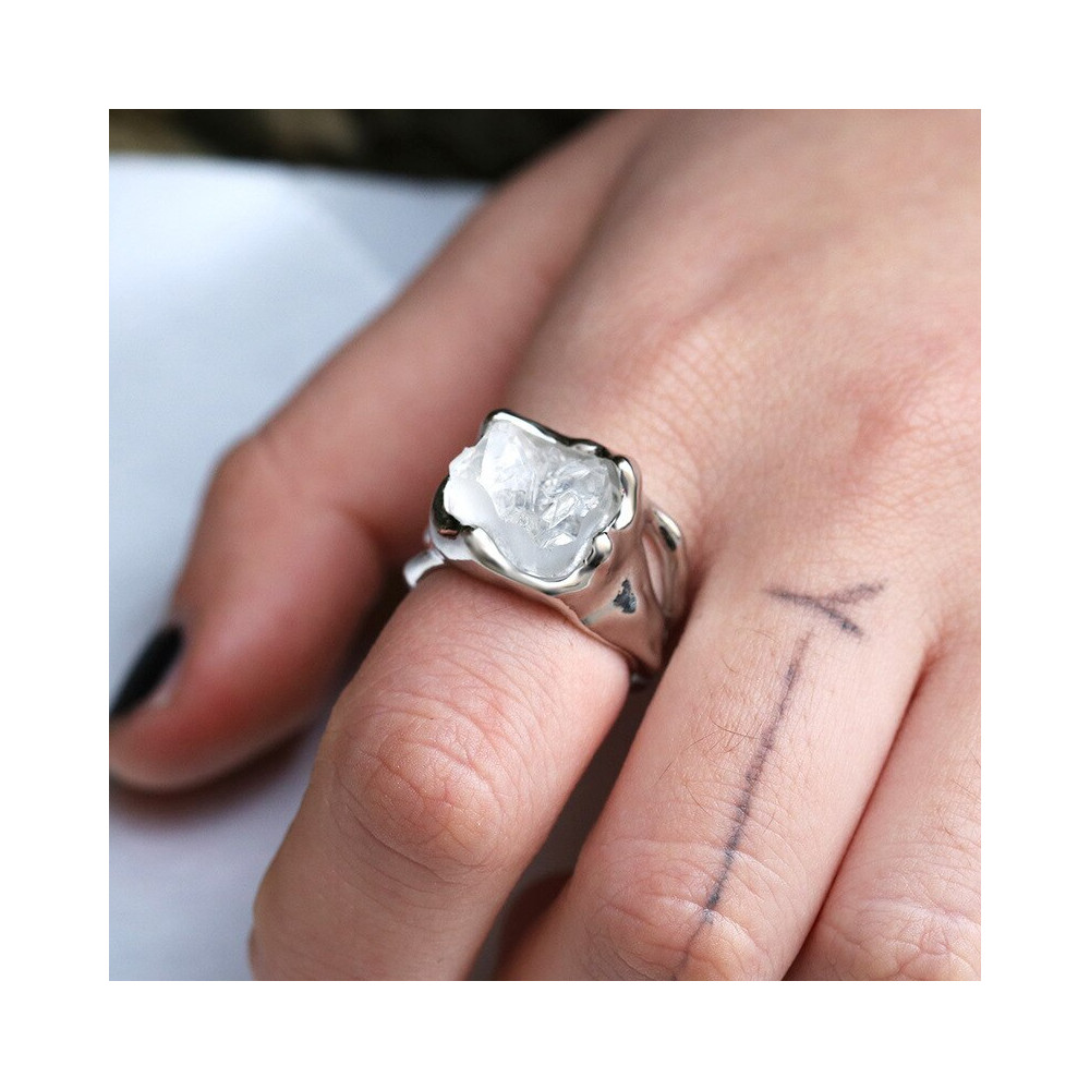 Dominantou prstenu je přírodní čirý krystal v surové podobě, zasazený do nepravidelného kovového lůžka. Každý kus je originál, stejně jako jeho nositel. Minimalistický a přesto výrazný – tento prsten zaujme nejen svým vzhledem, ale i energií.