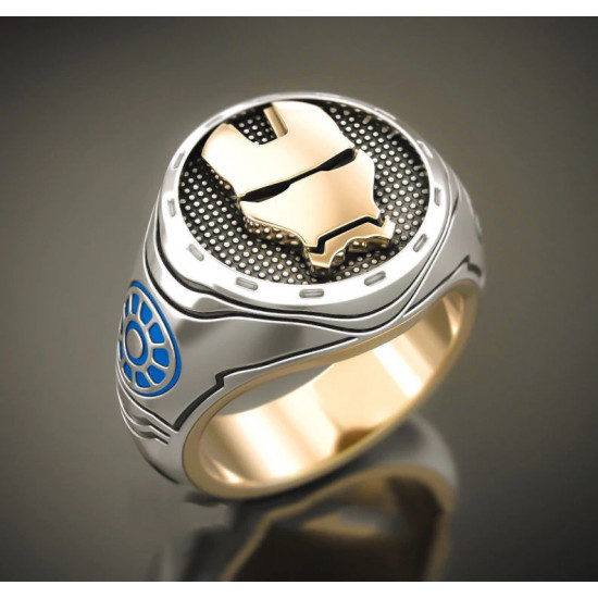 Na vrchní straně prstenu se nachází zlatá silueta Iron Manovy helmy, zasazená do kontrastního černého podkladu s mikrotexturou. Boky prstenu zdobí modré detaily připomínající obloukový reaktor, který pohání Iron Manův oblek. Elegantní kombinace stříbrné, zlaté a modré vytváří jedinečný vzhled plný charakteru.