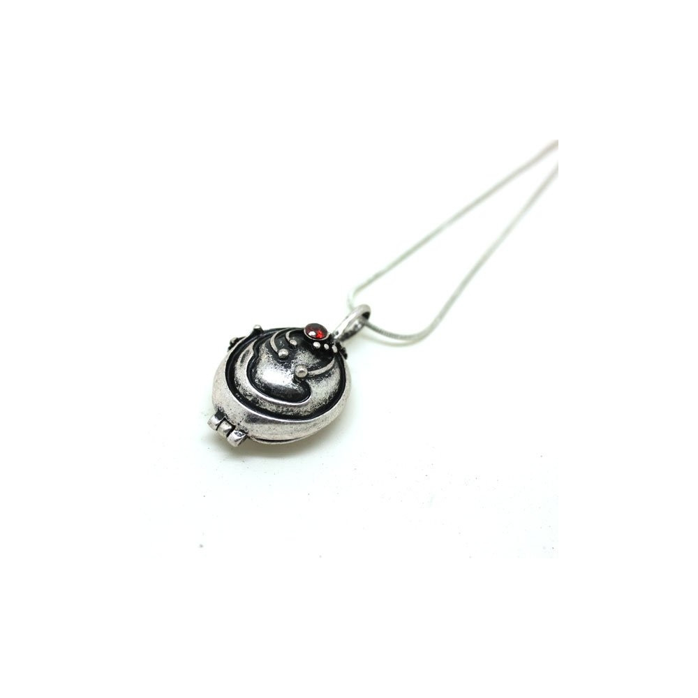 Rozevírací přívěsek v ikonickém designu ze seriálu ukrývá prostor pro drobný symbol či vzpomínku. Stříbrné provedení s výrazným reliéfem a červeným detailem působí elegantně, mysticky a stylově zároveň. Díky krátkému řetízku krásně sedí u krku.