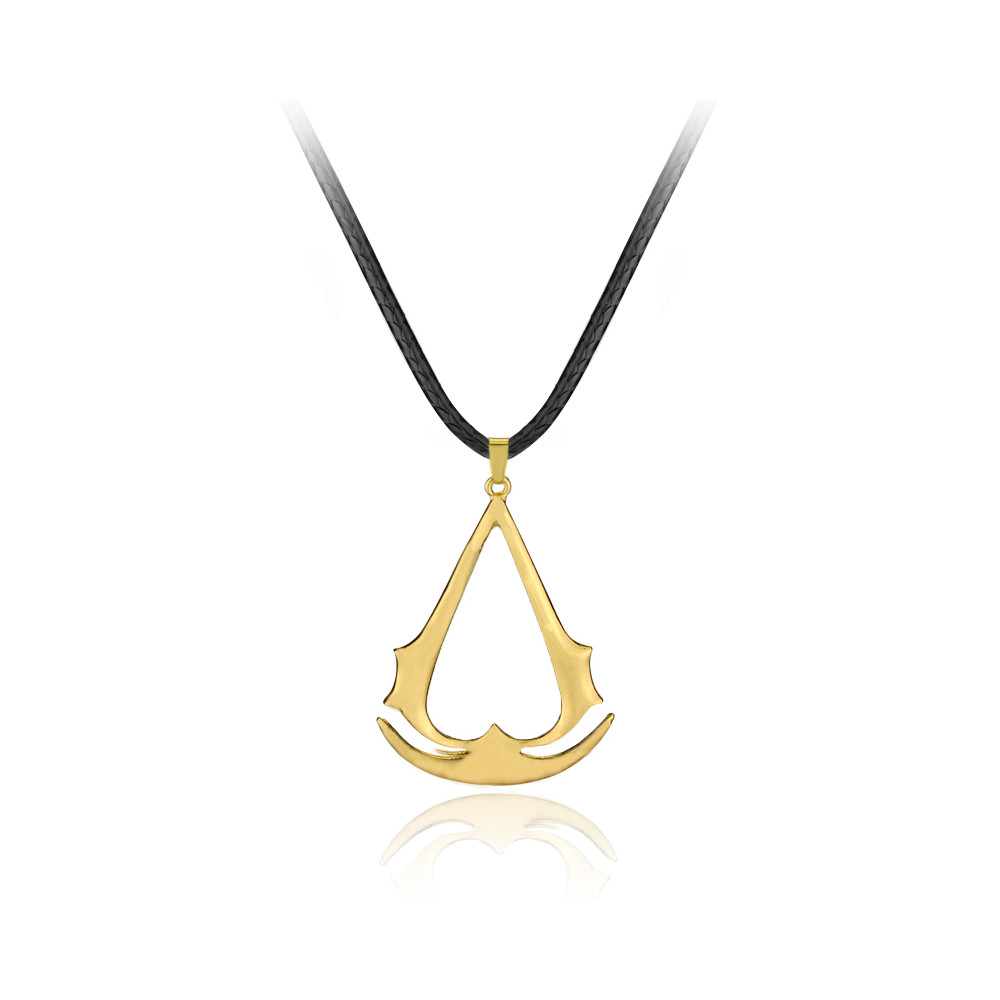 Stylový zlatý přívěsek se znakem Assassin's Creed na černé kožené šňůrce pro každého fanouška herní série.
