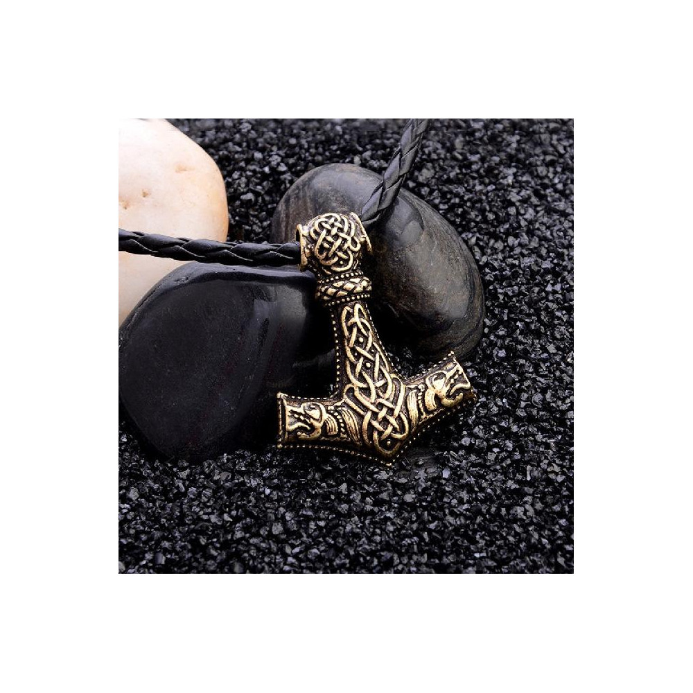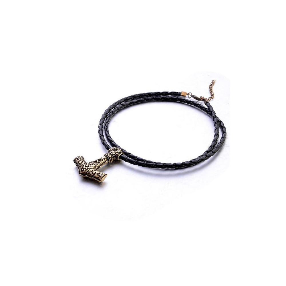 Masivní přívěsek ve tvaru Thórova kladiva je zdoben složitými runovými motivy a visí na elegantním černém koženém řemínku. Díky detailnímu zpracování a kvalitnímu materiálu působí autenticky a výrazně – ať už jej nosíte jako amulet nebo stylový doplněk.