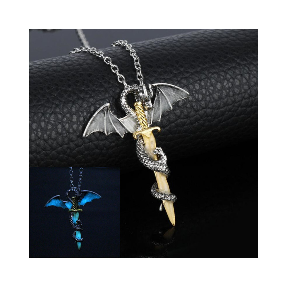 Přívěsek zobrazuje majestátního draka s roztaženými křídly, který se obtáčí kolem zlatého meče. Zajímavostí je svítící efekt, který se aktivuje ve tmě – ideální pro večerní atmosféru, cosplay nebo jako tajemný doplněk běžného outfitu. Vyrobený ze slitiny zinku a zavěšený na řetízku o délce 50 cm + prodloužení pro pohodlné nošení.